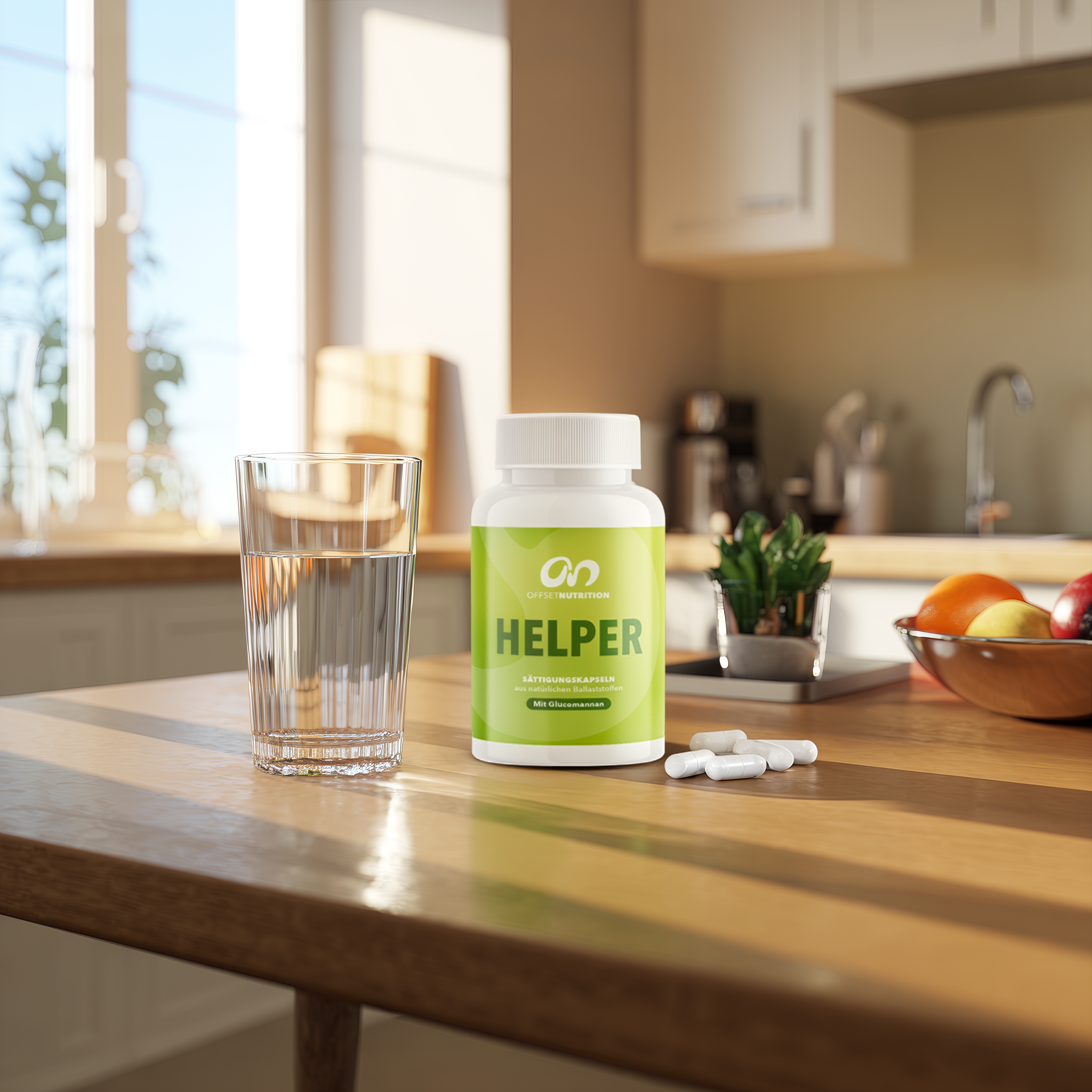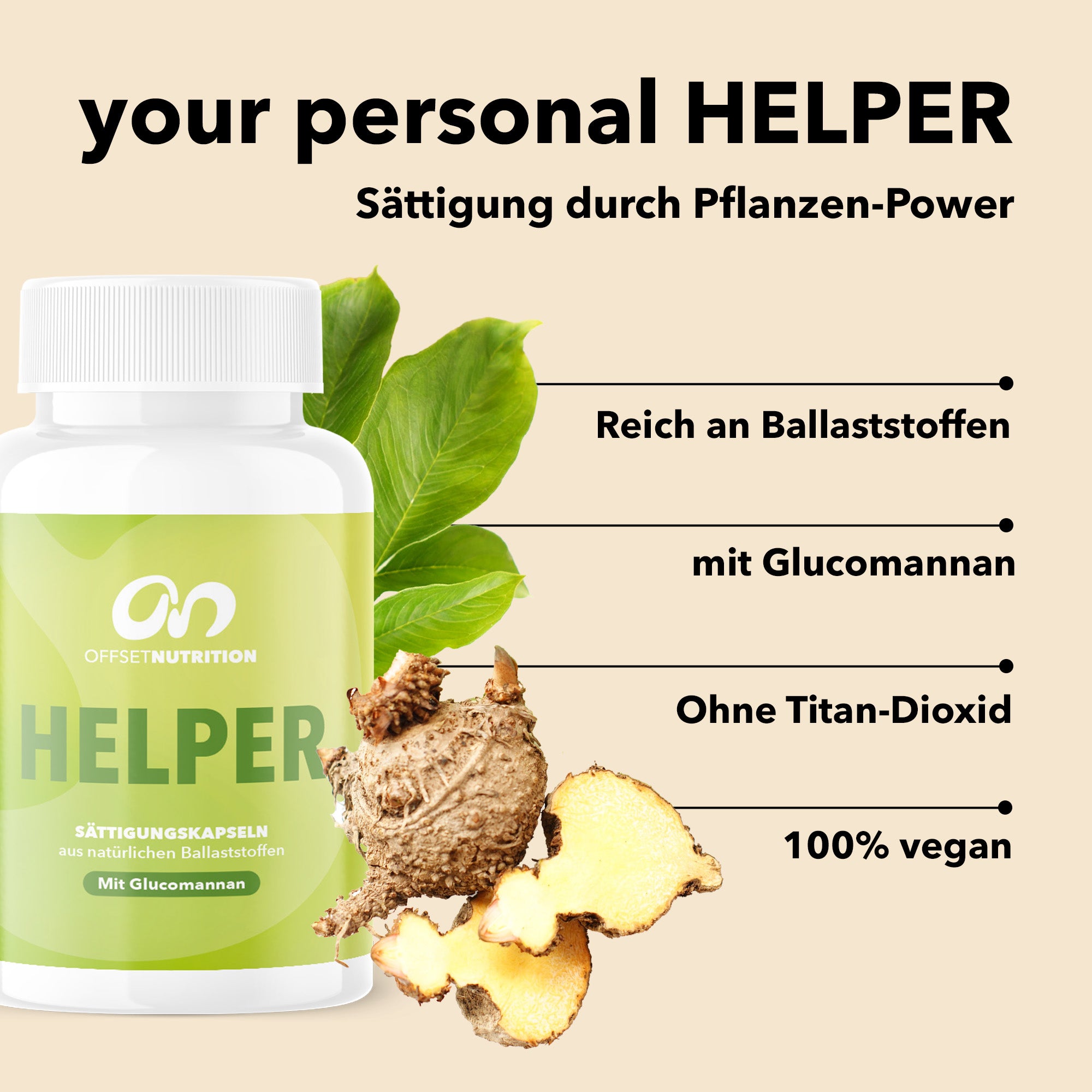 Helper ist mehr als nur ein Sättigungskapseln-Supplement – es ist dein täglicher Begleiter gegen Heißhunger und übermäßigen Appetit! Der enthaltene Ballaststoff Glucomannan wird aus der japanischen Konjakwurzel gewonnen und hat eine beeindruckende Eigenschaft: In Verbindung mit Wasser quillt er auf das 50-fache seiner Größe auf. Der Magen füllt sich, signalisiert Sättigung – und du wirst mit kleineren Portionen satt.