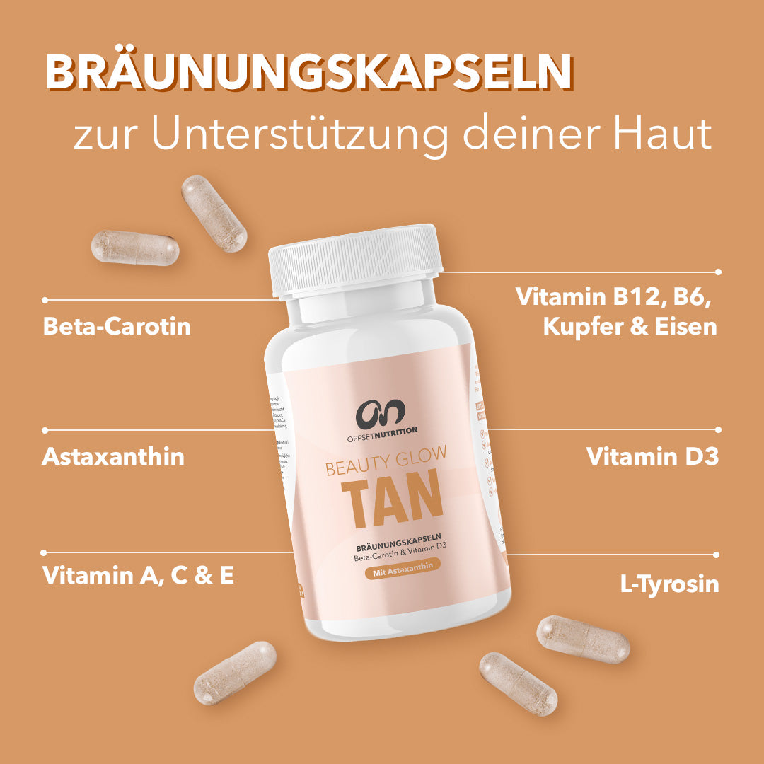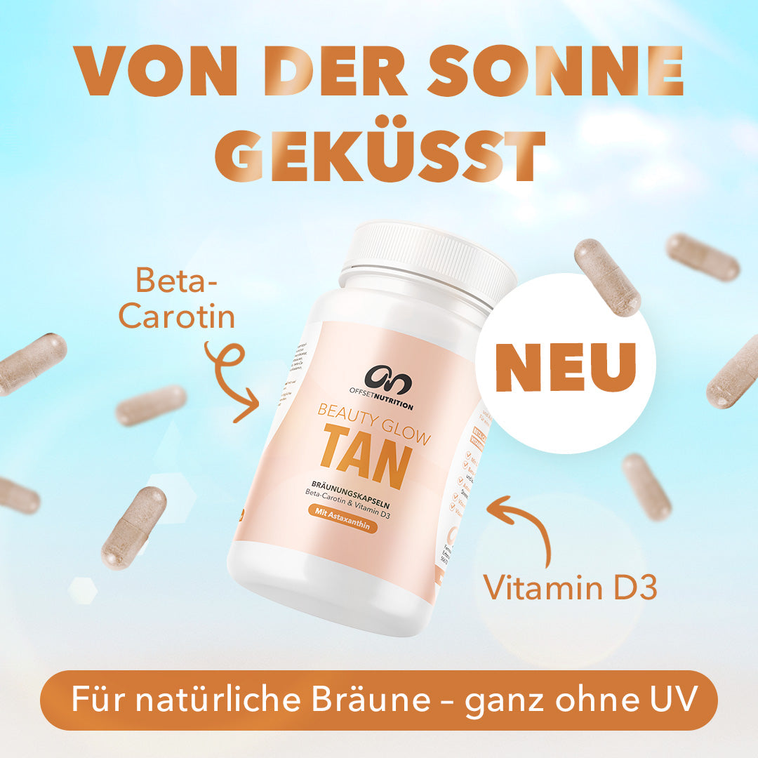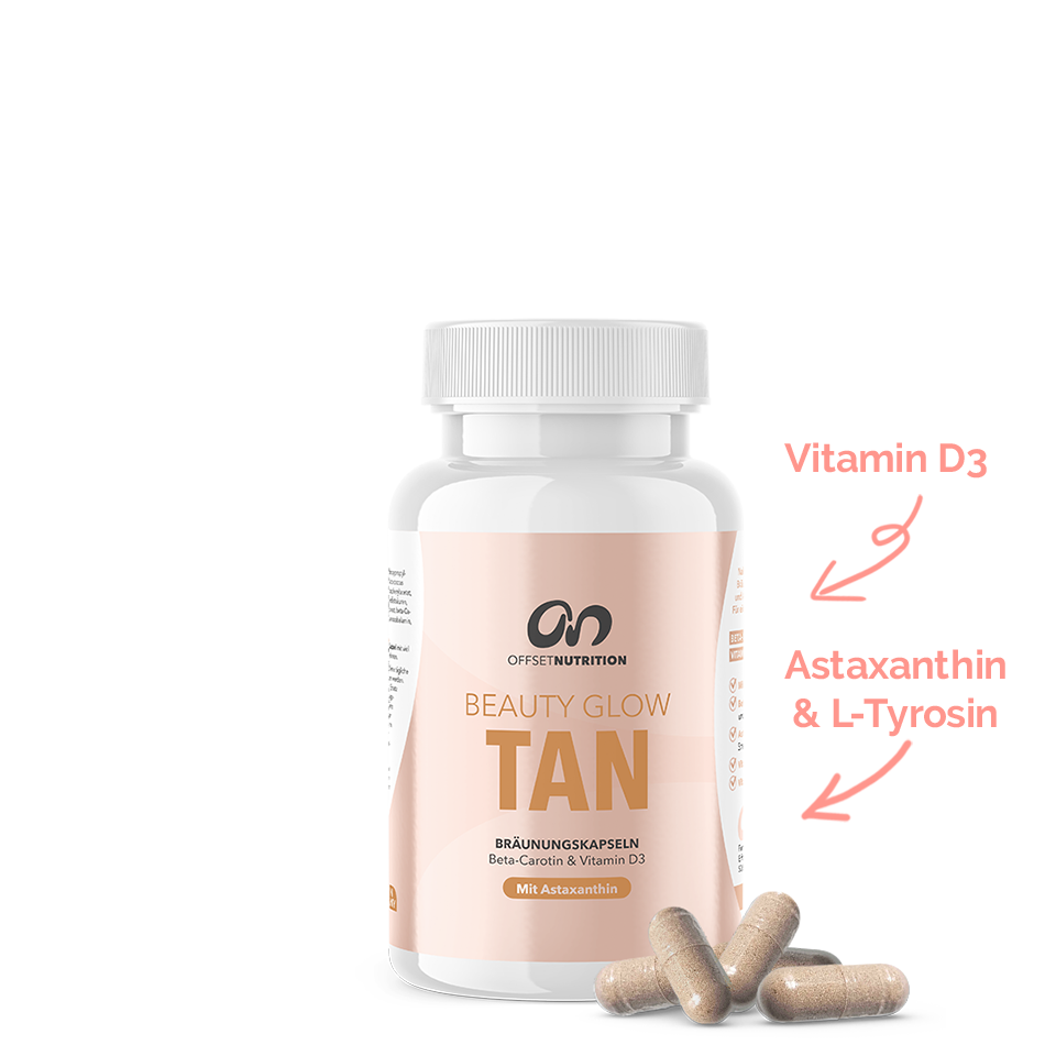 Do you know this? Pale skin, little time for sunbathing and the solarium is not an option? We have the solution: 3 capsules a day and your skin will glow from within! Our Beauty Glow Tan contains a powerful combination of beta-carotene, vitamin D3 and valuable antioxidants that support your natural glow - for healthy radiance, a strong immune system and a radiant complexion all year round.