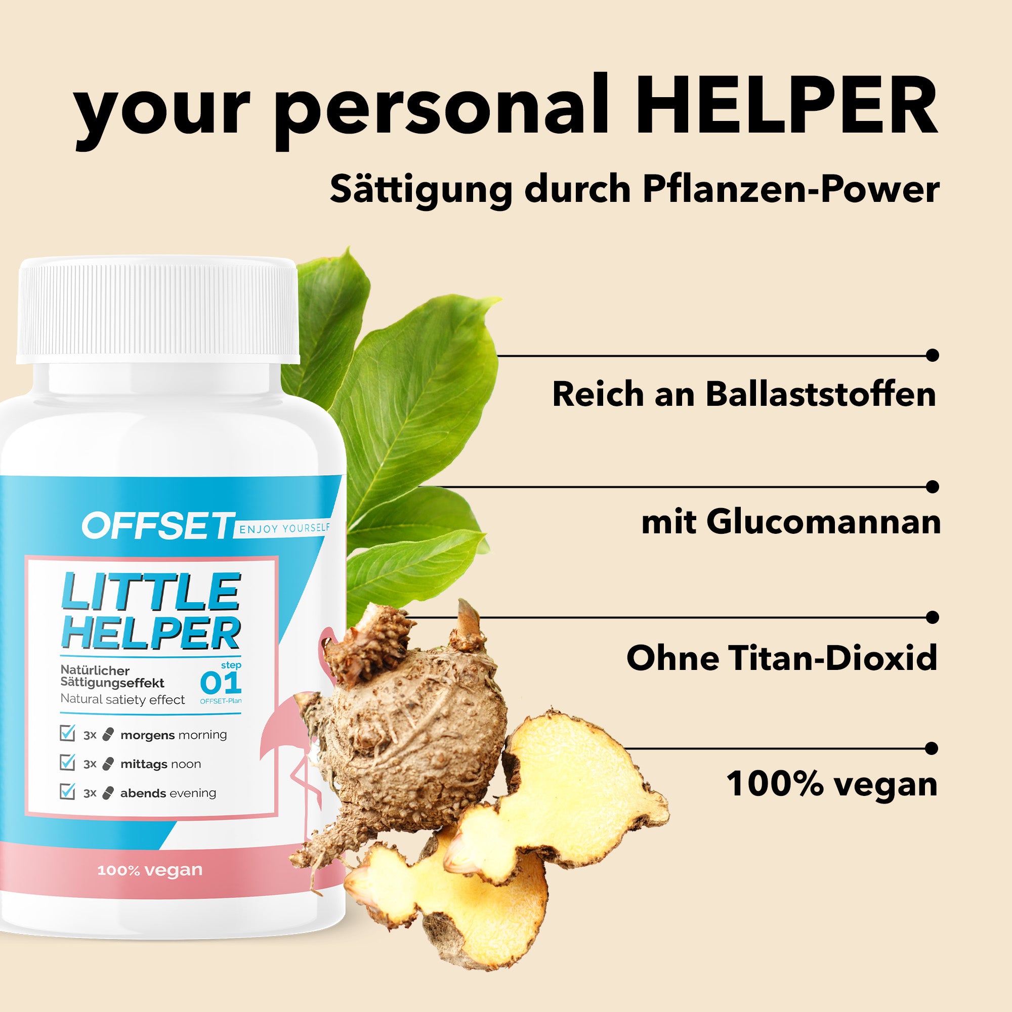 Do you know this? Your eyes are hungrier than your stomach, you eat too quickly and have already eaten double the portion before you feel full. Or shortly after breakfast your appetite comes back - even though you're not really hungry. That's over now! Our Helper capsules with glucomannan support your feeling of satiety in a natural way, so that you feel full even with smaller portions and have the desire to eat under control until the next meal.