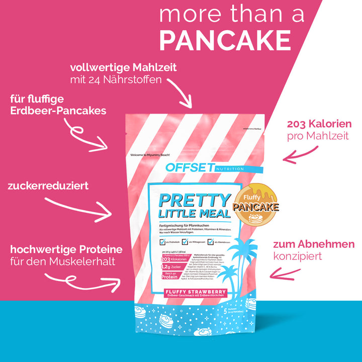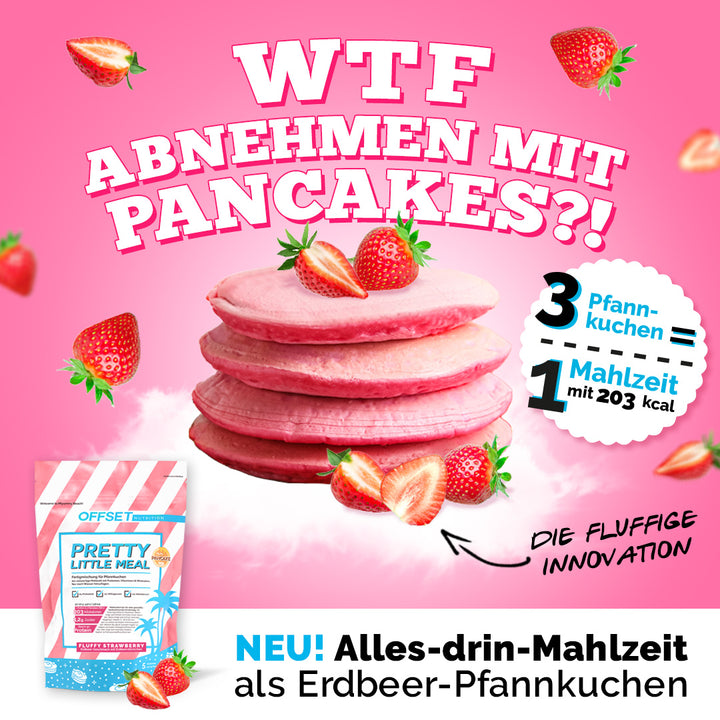 Losing weight is so easy with Pretty Little Meal pancakes: Simply replace 2 meals a day with one PLM each. The choice is yours - 1 milkshake, 1 bar, 1 muesli, 1 porridge or 3 yummy PANCAKES! Add a delicious recipe from the free OFFSET app and drink 2-3 liters of water throughout the day. Et voilà! Nothing stands in the way of your feel-good figure!