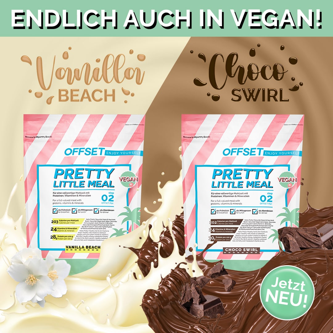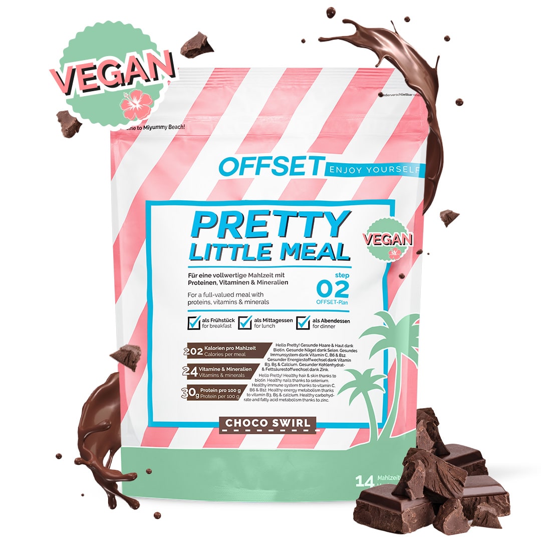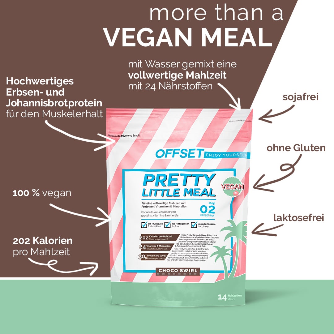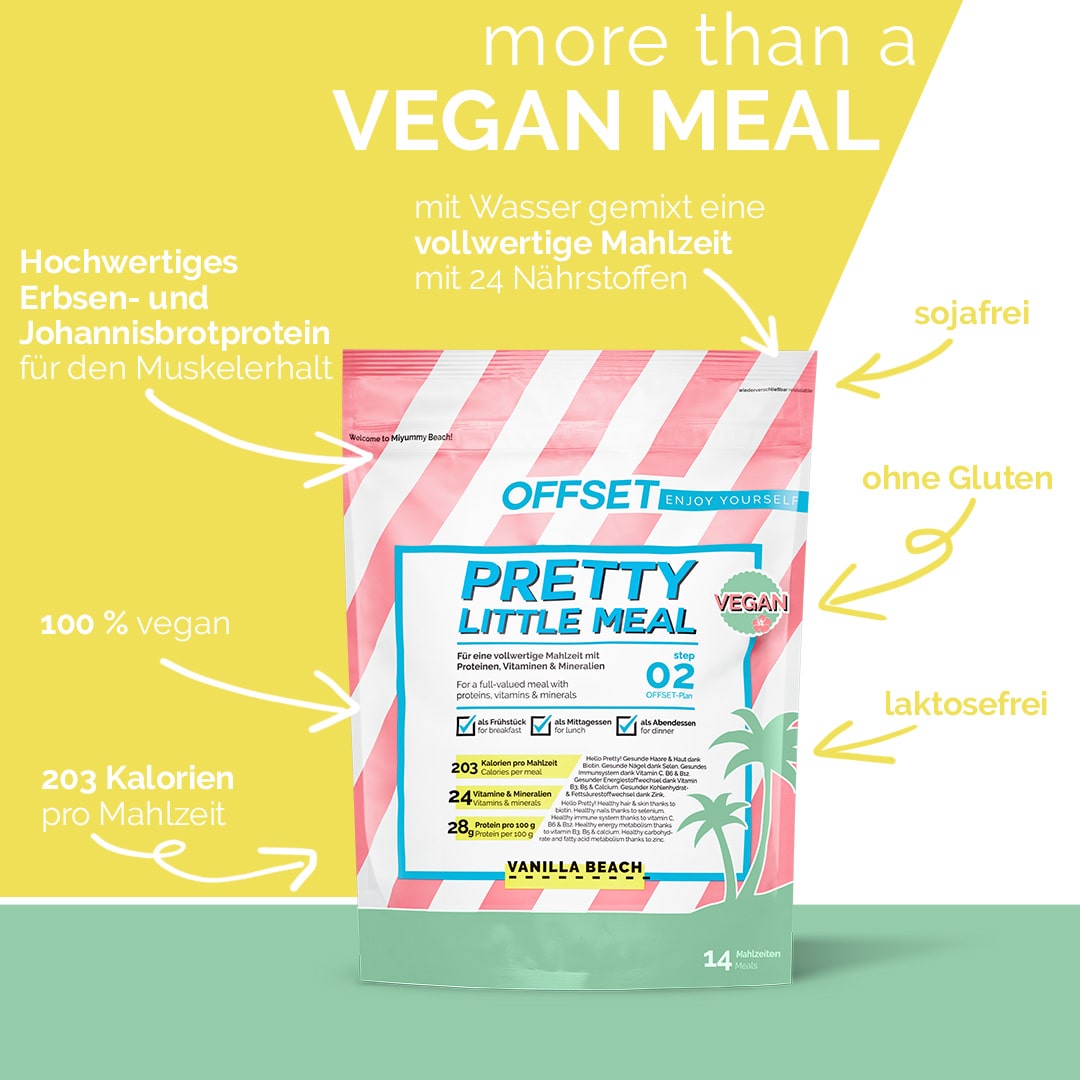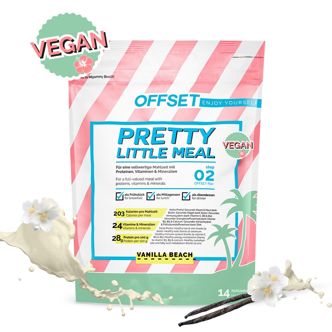 Pretty Little Meal vegan - pretty smart. During your OFFSET plan, you can easily help your body to get rid of sugar. At the same time, you get all the important micro and macronutrients your body needs. In combination with your delicious mixed meals, you can achieve your Pretty New Me.