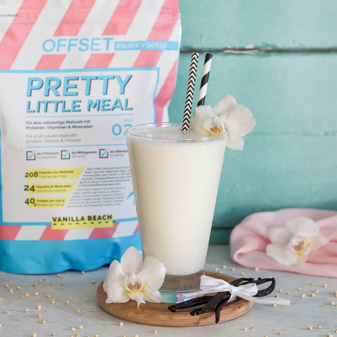 Our Pretty Little Meal is a complete meal when mixed with milk, providing you with 24 important vitamins and minerals as well as protein. Your body needs these so that it is properly nourished despite your calorie deficit and does not develop deficiency symptoms. A protein shake cannot provide you with all the nutrients your body needs to be fully nourished. It is therefore only intended to support muscle building after sports sessions.