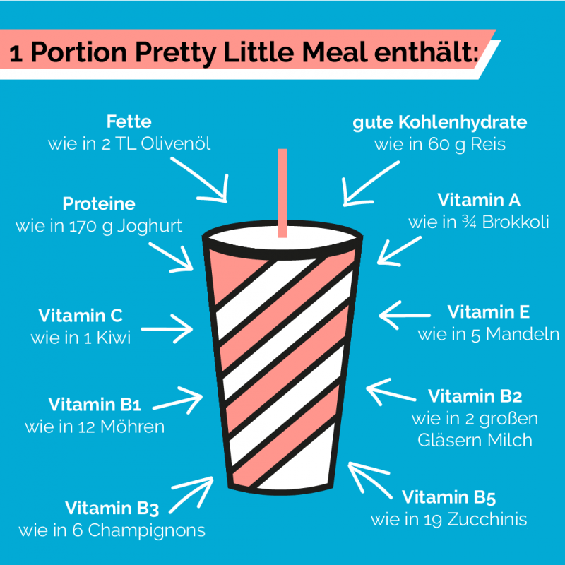 Pretty Little Meal erfüllt nur in diesem Rahmen ihren angestrebten Zweck. Andere Lebensmittel müssen Teil dieser Ernährung sein. Schaue dafür auch in unsere kostenlose OFFSET-App mit vielen leckeren Rezepten für Mixed Meals. Trinke dazu täglich 2-3 Liter Wasser. Um abzunehmen, sollten täglich zwei Hauptmahlzeiten durch je eine Pretty Little Meal-Mahlzeit ersetzt werden. Um das Gewicht zu halten, sollte täglich eine Hauptmahlzeit durch eine Pretty Little Meal-Mahlzeit ersetzt werden.