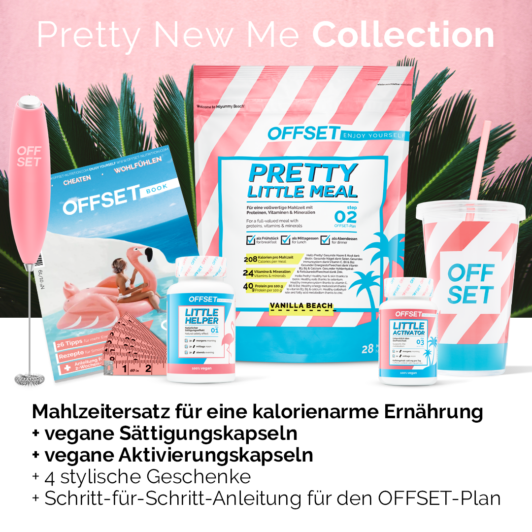 Genau auf den OFFSET-Plan abgestimmt ist die Pretty New Me Collection dein Starter-Paket für deine Diät und dein Pretty New Me: Mahlzeitersatz zur Zubereitung leckerer Mahlzeiten, clevere, kleine Helfer, ein Buch mit genauer Schritt-für-Schritt-Anleitung für deine Diät, Diät-Rezepten und tollen Diät-Tipps, passende Accessoires wie den OFFSET-Becher, einen elektrischen OFFSET-Mixer und vieles mehr. Du fügst nur noch die Milch und die frischen Zutaten hinzu. Die persönliche Betreuung von unserem OFFSET-Kundendienst gehört übrigens für uns dazu. Wir stehen dir mit Rat und Tat zur Seite – denn dein Erfolg liegt uns am Herzen! Also worauf wartest du noch? Entdecke noch heute deine Diät mit Spaßfaktor. Let’s #offsetbabe