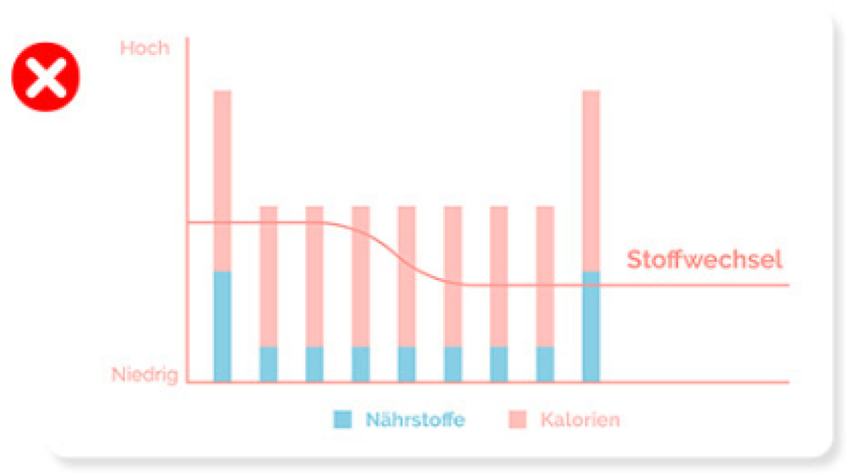 Herkömmliche Diäten setzen oft auf strikte Kalorienreduktion mit Kalorienzählen. Sie beachten dabei aber nicht die richtige Zufuhr an Nährstoffen. Damit kommt der Körper in einen Mangel, fährt den Stoffwechsel runter. Der Gewichtsverlust und Fettabbau stagnieren und nach der Diät setzt der Jo-Jo Effekt ein. Denn der Körper holt sich die Nährstoffe wieder zurück, auf die er verzichten musste.