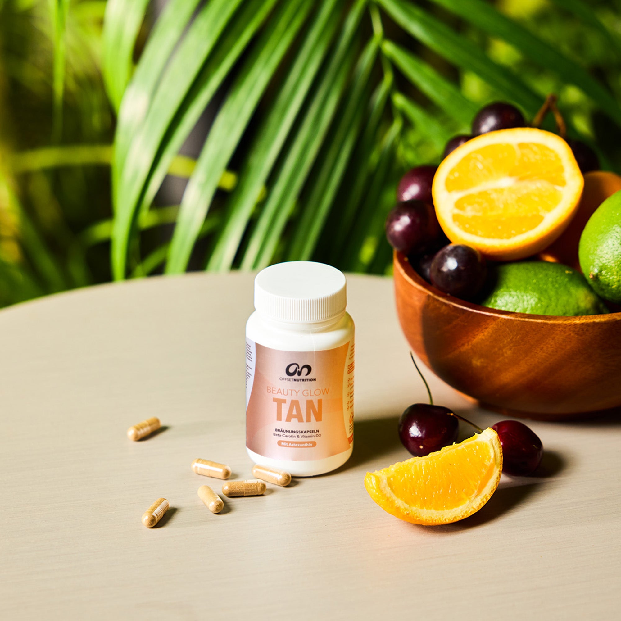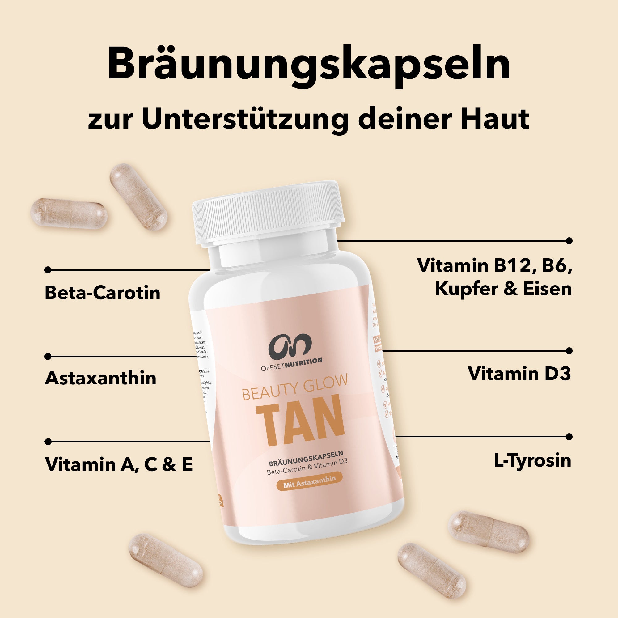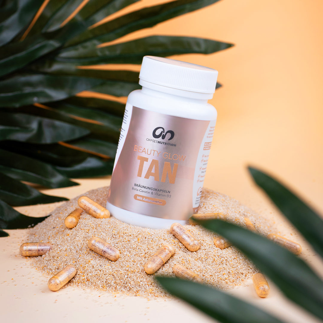 Kennst du das? Blasse Haut, wenig Zeit für Sonnenbäder und das Solarium ist keine Option? We got you: Täglich 3 Kapseln Beauty Glow Tan und deine Haut strahlt von innen! Unsere Bräunungskapseln enthalten eine kraftvolle Kombination aus Beta-Carotin, Vitamin D3 und wertvollen Antioxidantien wie Astaxanthin, die deinen natürlichen Glow unterstützen – für eine gesündere Ausstrahlung, unterstütztes Immunsystem und ein strahlendes Hautbild das ganze Jahr über.