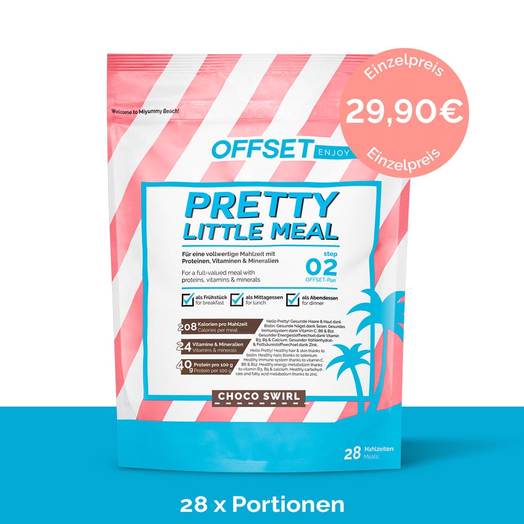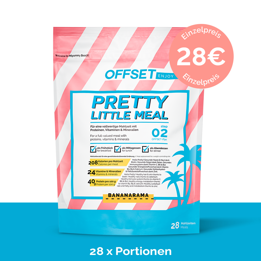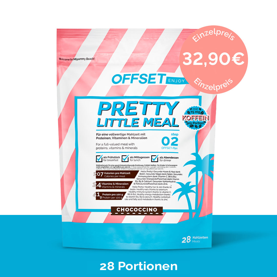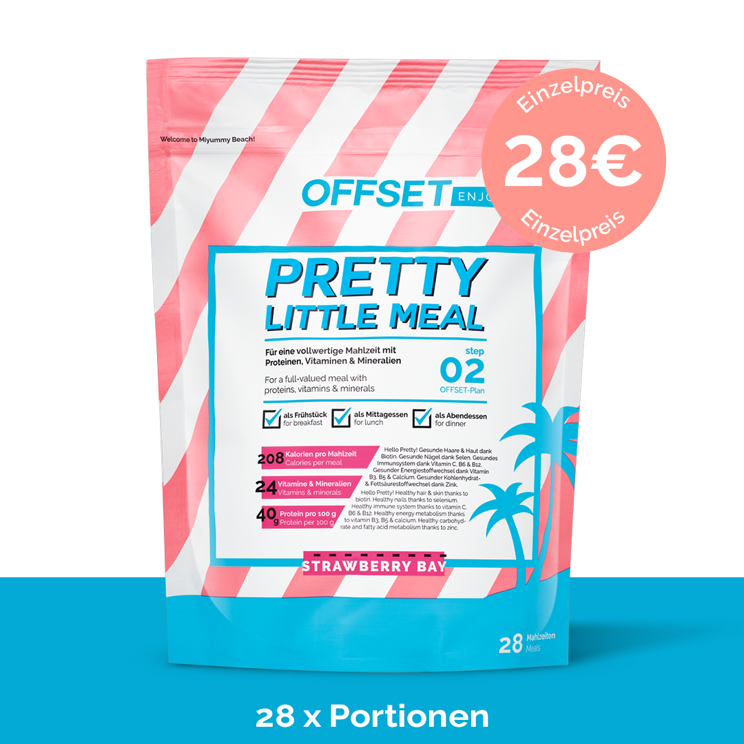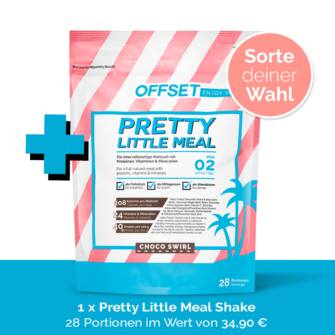 Pretty Little Meal erfüllt nur in diesem Rahmen ihren angestrebten Zweck. Andere Lebensmittel müssen Teil dieser Ernährung sein. Schaue dafür auch in unsere kostenlose OFFSET-App mit vielen leckeren Rezepten für Mixed Meals. Trinke dazu täglich 2-3 Liter Wasser. Um abzunehmen, sollten täglich zwei Hauptmahlzeiten durch je eine Pretty Little Meal-Mahlzeit ersetzt werden. Um das Gewicht zu halten, sollte täglich eine Hauptmahlzeit durch eine Pretty Little Meal-Mahlzeit ersetzt werden.