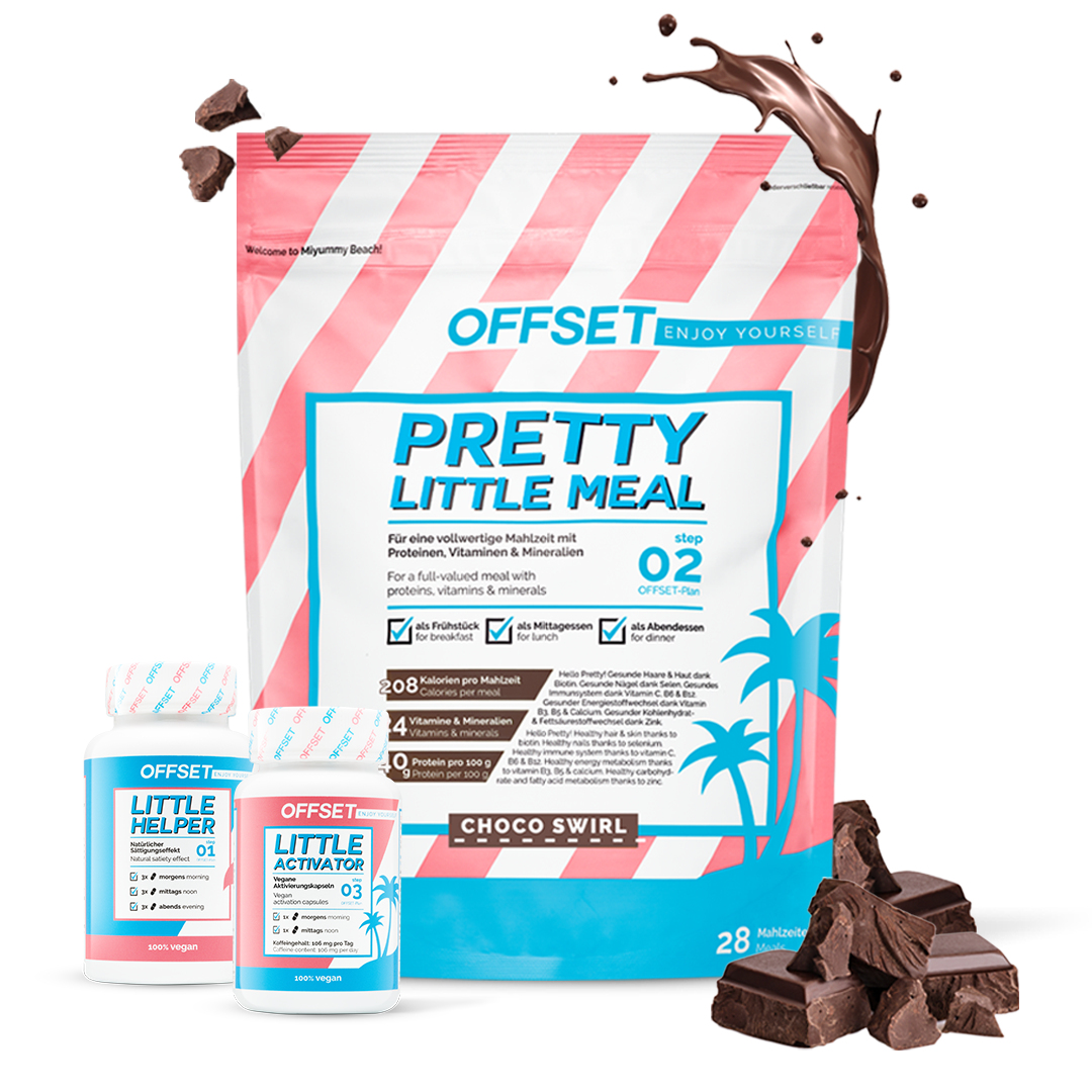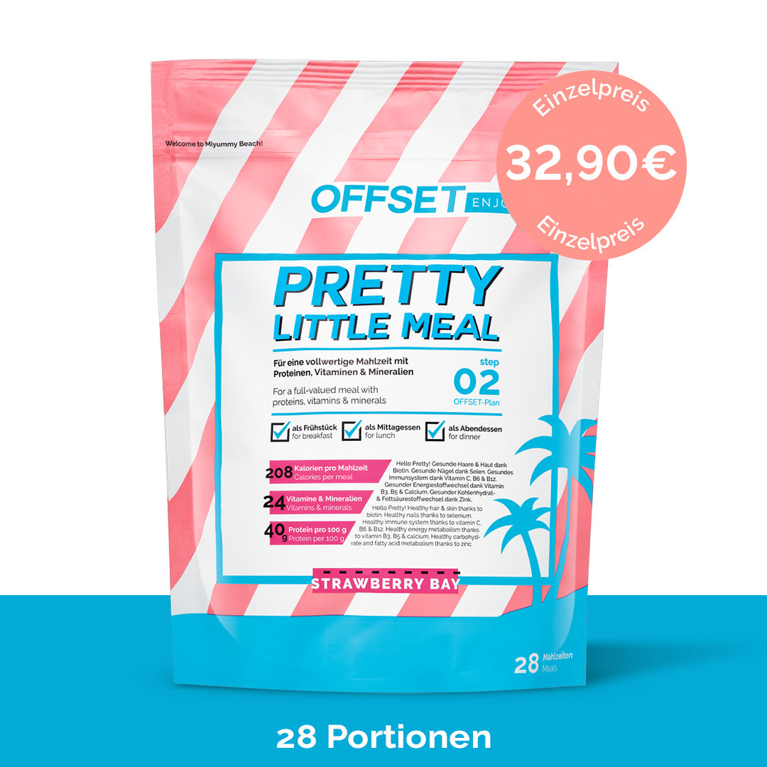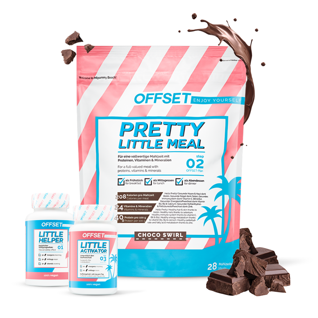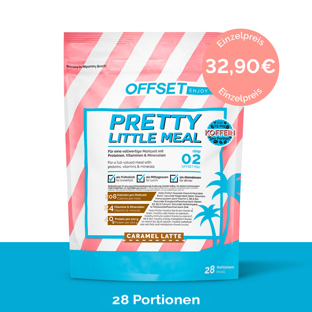 Pretty Little Meal erfüllt nur in diesem Rahmen ihren angestrebten Zweck. Andere Lebensmittel müssen Teil dieser Ernährung sein. Schaue dafür auch in unsere kostenlose OFFSET-App mit vielen leckeren Rezepten für Mixed Meals. Trinke dazu täglich 2-3 Liter Wasser. Um abzunehmen, sollten täglich zwei Hauptmahlzeiten durch je eine Pretty Little Meal-Mahlzeit ersetzt werden. Um das Gewicht zu halten, sollte täglich eine Hauptmahlzeit durch eine Pretty Little Meal-Mahlzeit ersetzt werden.