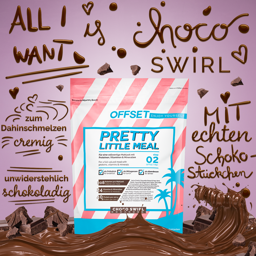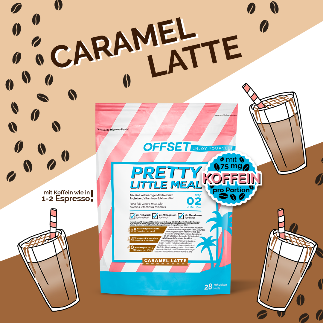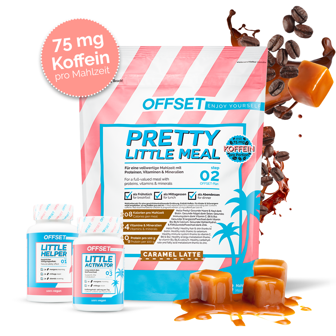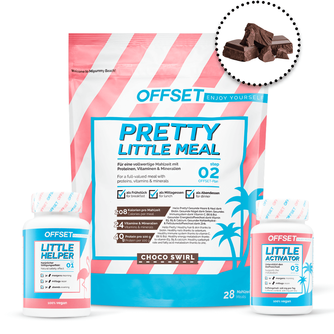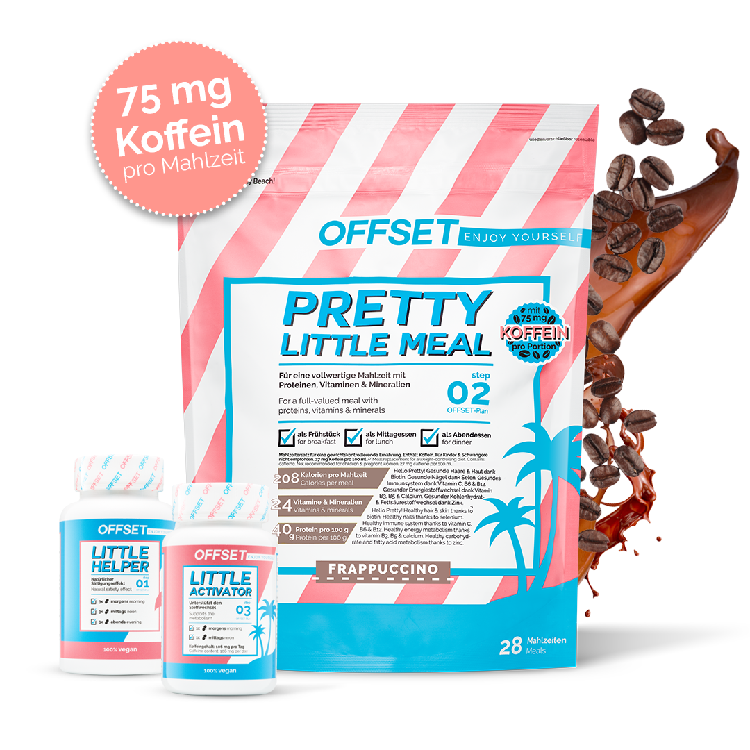 Pretty Little Meal erfüllt nur in diesem Rahmen ihren angestrebten Zweck. Andere Lebensmittel müssen Teil dieser Ernährung sein. Schaue dafür auch in unsere kostenlose OFFSET-App mit vielen leckeren Rezepten für Mixed Meals. Trinke dazu täglich 2-3 Liter Wasser. Um abzunehmen, sollten täglich zwei Hauptmahlzeiten durch je eine Pretty Little Meal-Mahlzeit ersetzt werden. Um das Gewicht zu halten, sollte täglich eine Hauptmahlzeit durch eine Pretty Little Meal-Mahlzeit ersetzt werden.