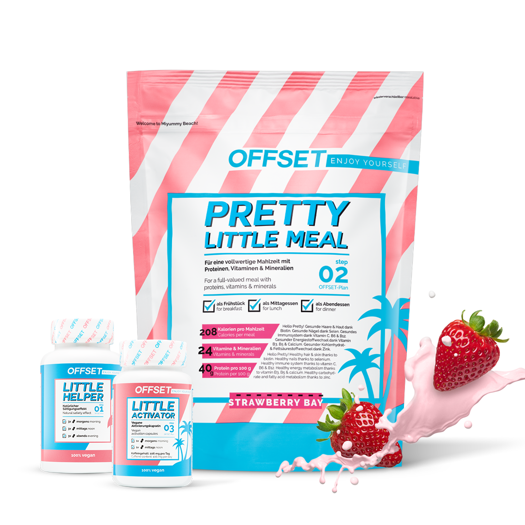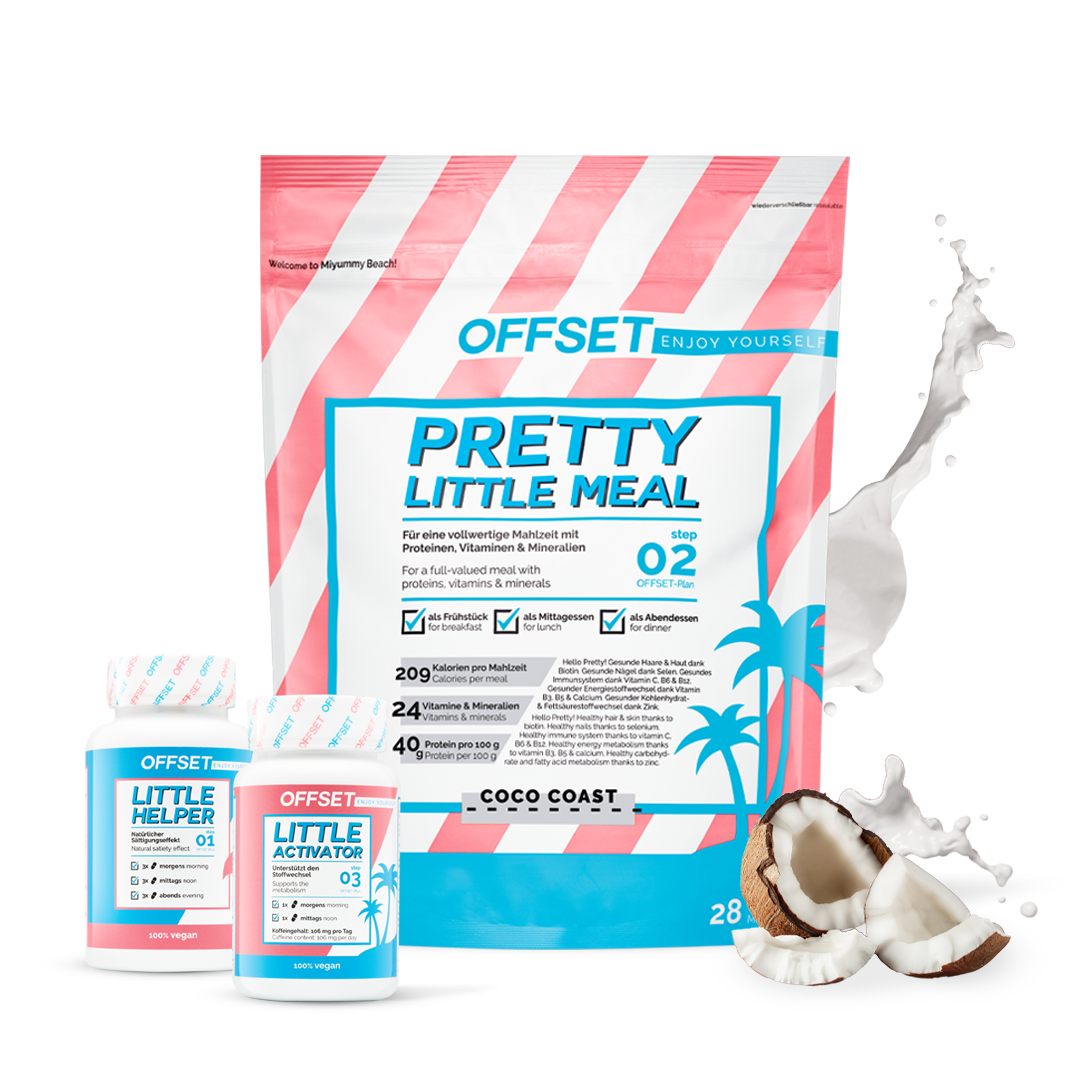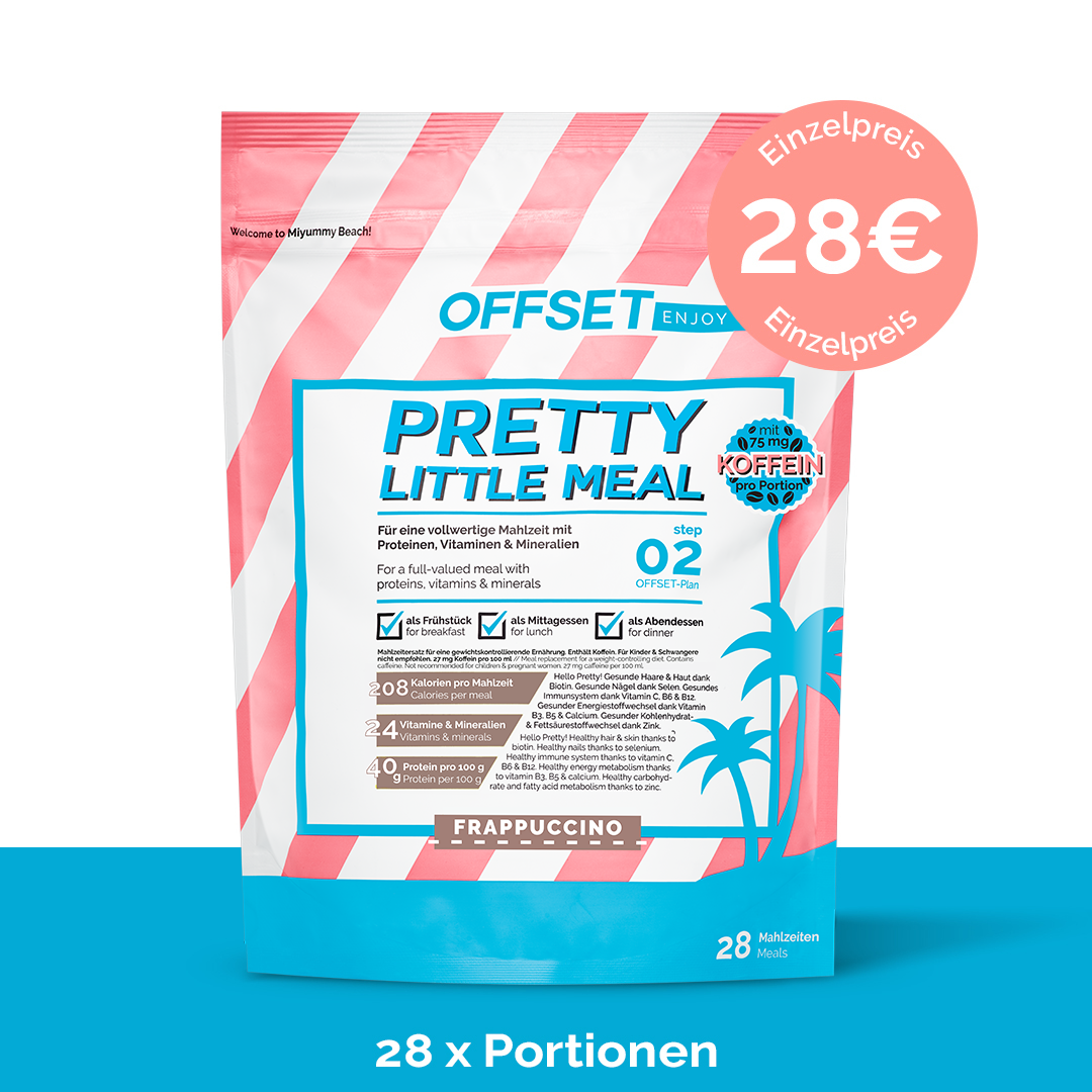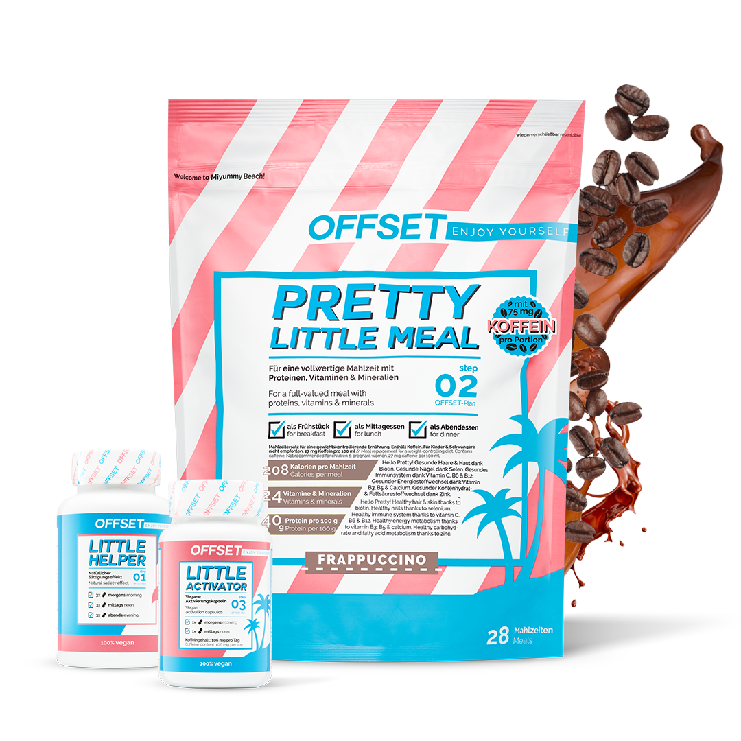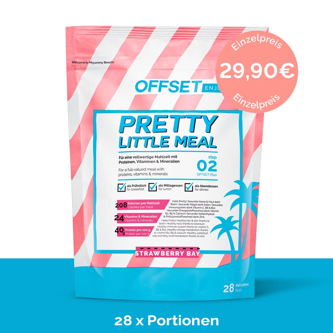 Pretty Little Meal erfüllt nur in diesem Rahmen ihren angestrebten Zweck. Andere Lebensmittel müssen Teil dieser Ernährung sein. Schaue dafür auch in unsere kostenlose OFFSET-App mit vielen leckeren Rezepten für Mixed Meals. Trinke dazu täglich 2-3 Liter Wasser.