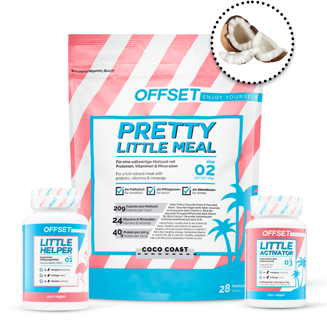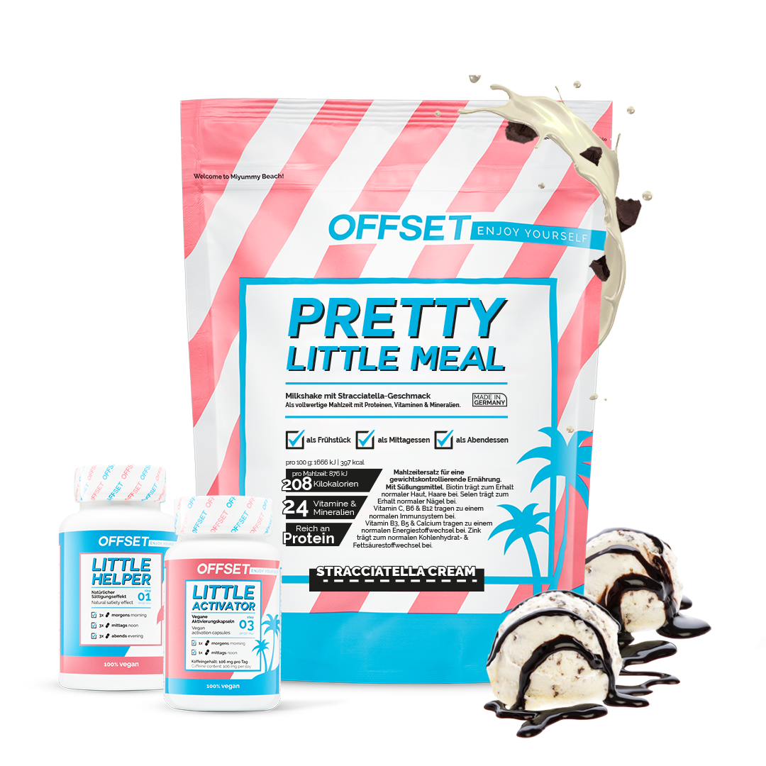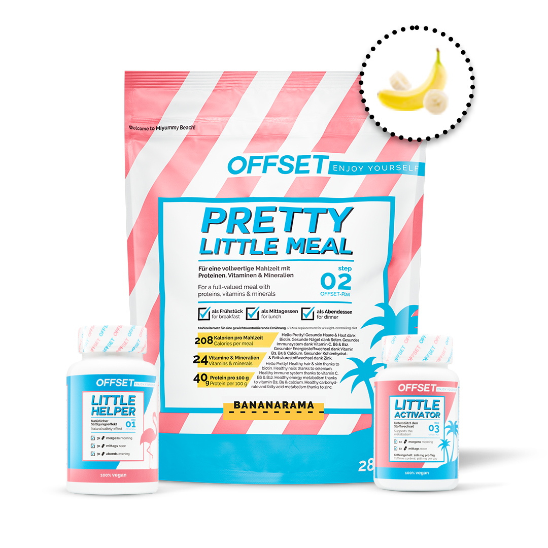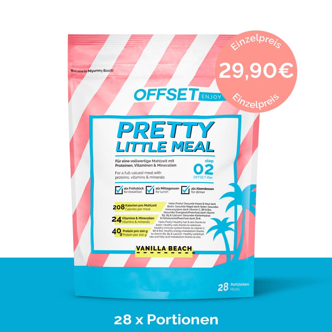 Pretty Little Meal erfüllt nur in diesem Rahmen ihren angestrebten Zweck. Andere Lebensmittel müssen Teil dieser Ernährung sein. Schaue dafür auch in unsere kostenlose OFFSET-App mit vielen leckeren Rezepten für Mixed Meals. Trinke dazu täglich 2-3 Liter Wasser.