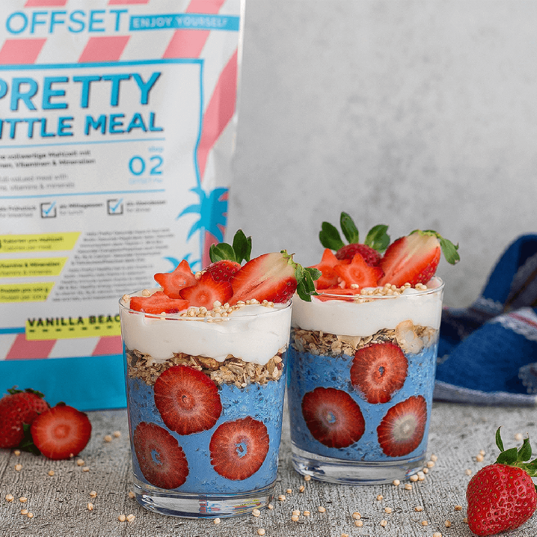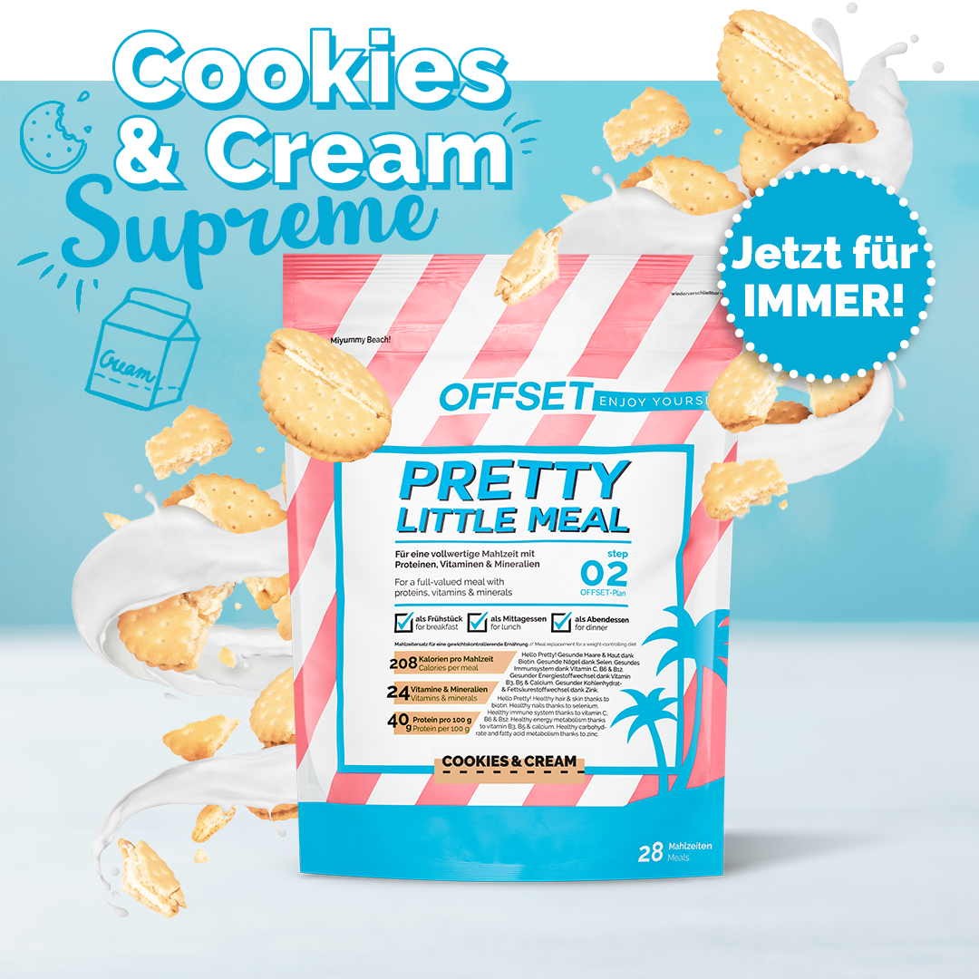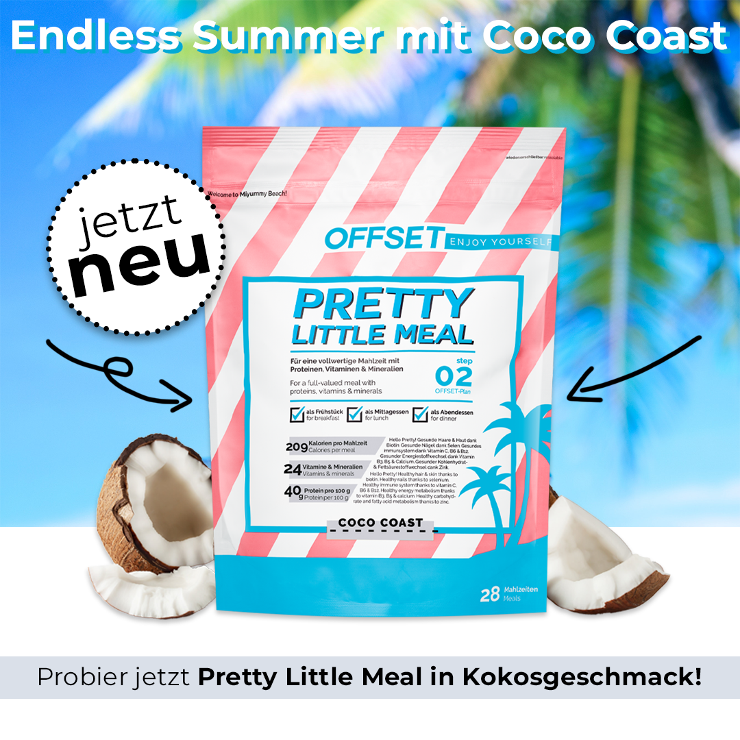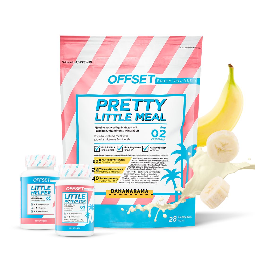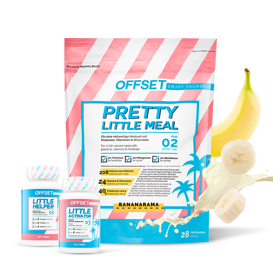Pretty Little Meal erfüllt nur in diesem Rahmen ihren angestrebten Zweck. Andere Lebensmittel müssen Teil dieser Ernährung sein. Schaue dafür auch in unsere kostenlose OFFSET-App mit vielen leckeren Rezepten für Mixed Meals. Trinke dazu täglich 2-3 Liter Wasser.