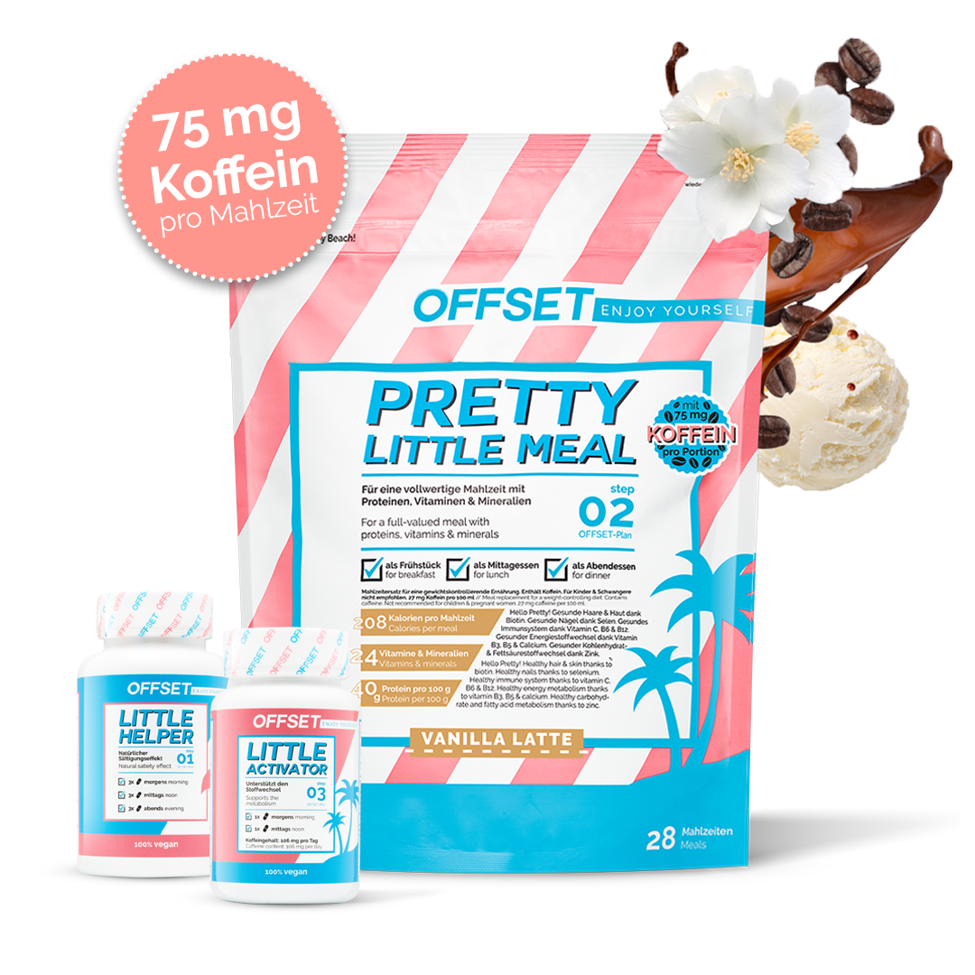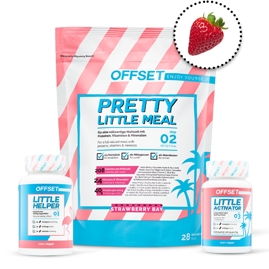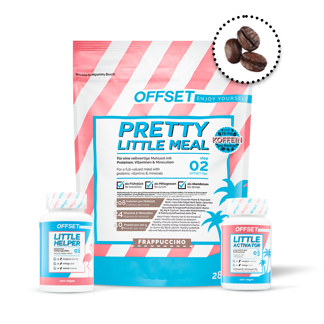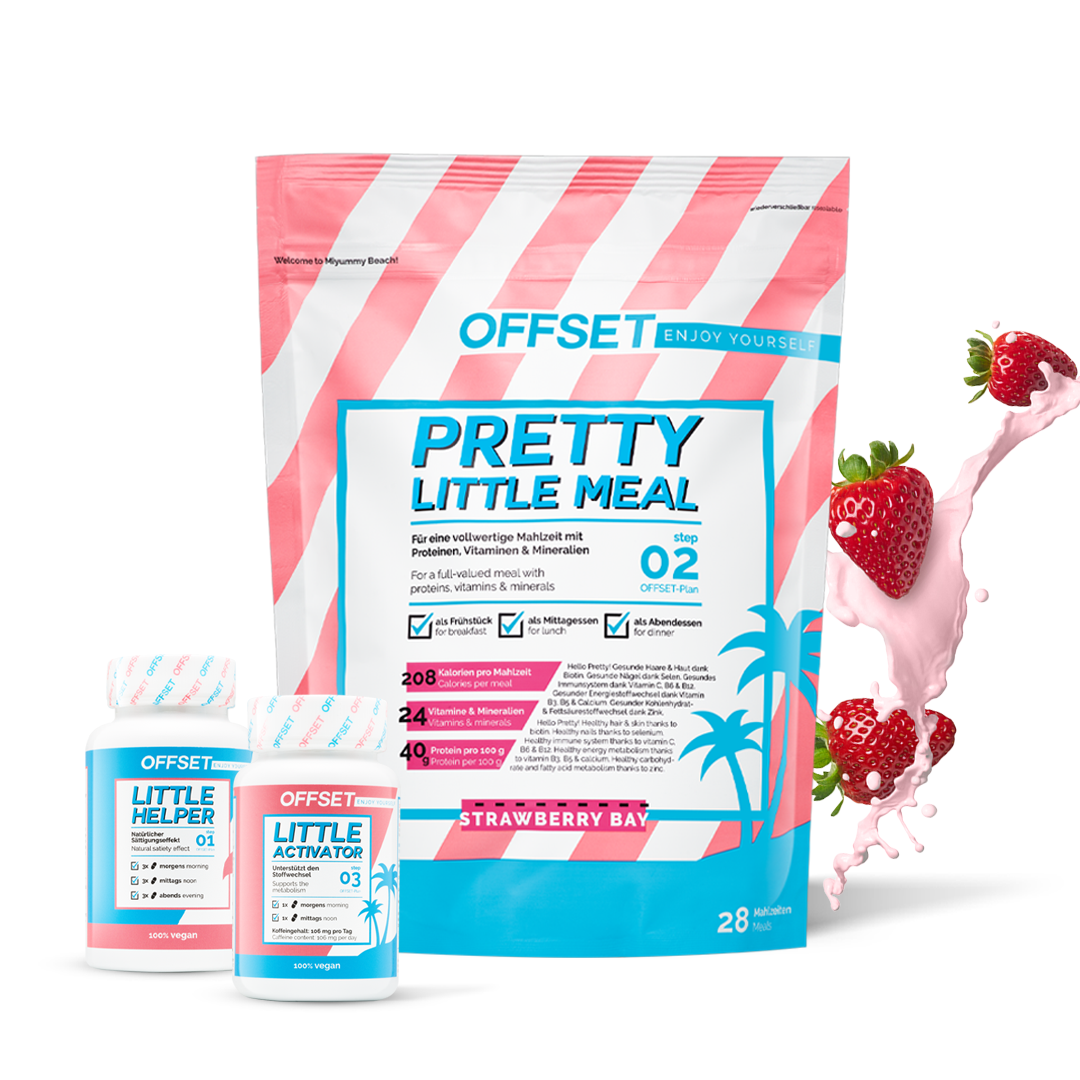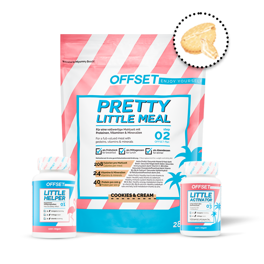 Pretty Little Meal - ganz schön smart. Während deines OFFSET-Plans unterstützt du deinen Körper, spielend leicht vom Zucker loszukommen. Gleichzeitig erhältst du alle wichtigen Mikro- und Makronährstoffe, die dein Körper benötigt. In Kombination mit deinem leckeren Mixed Meal erzielst du dein Pretty New Me.