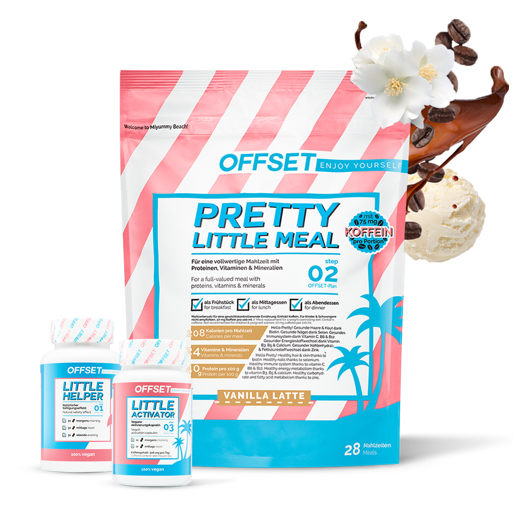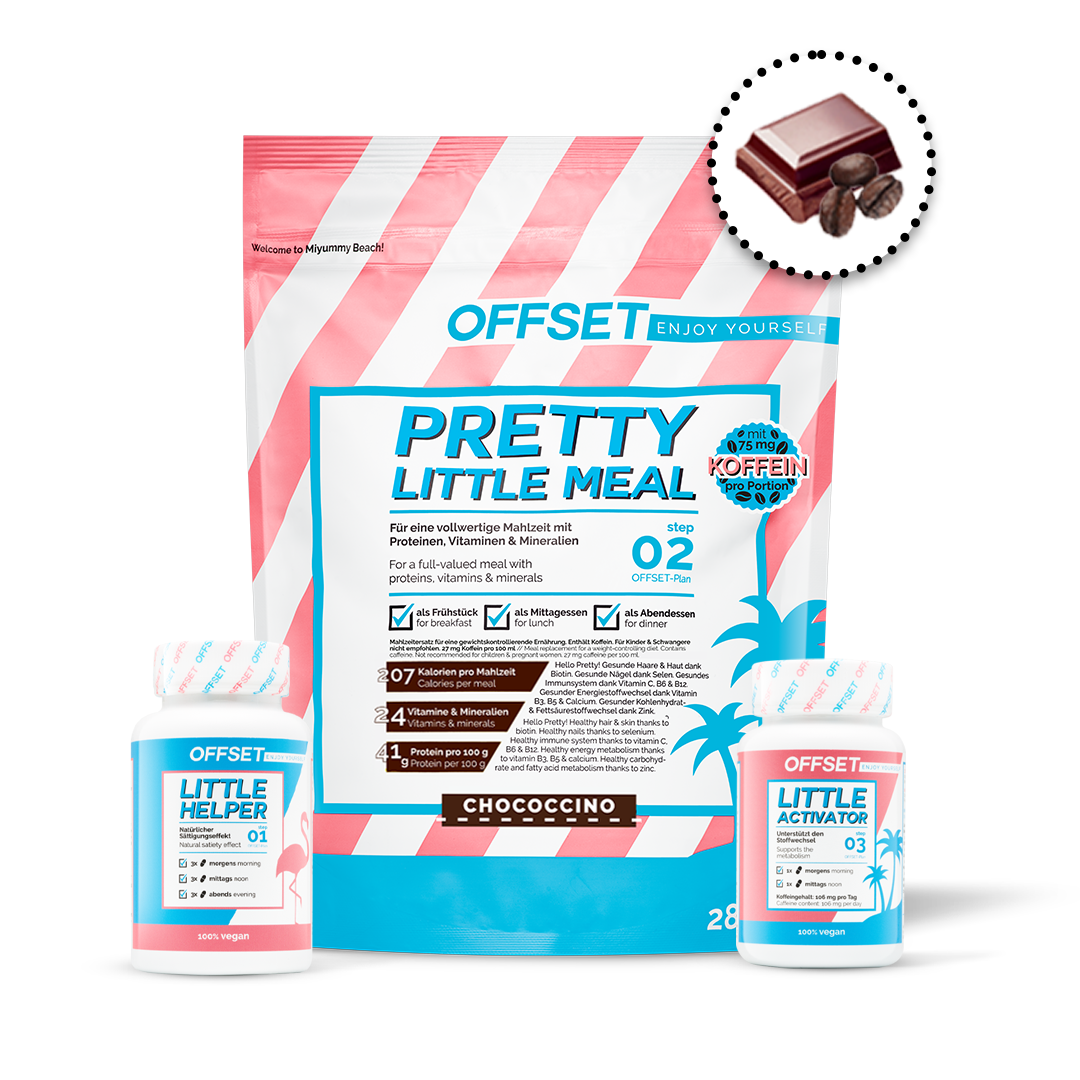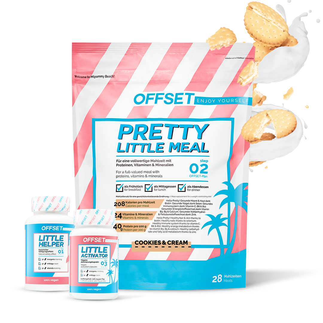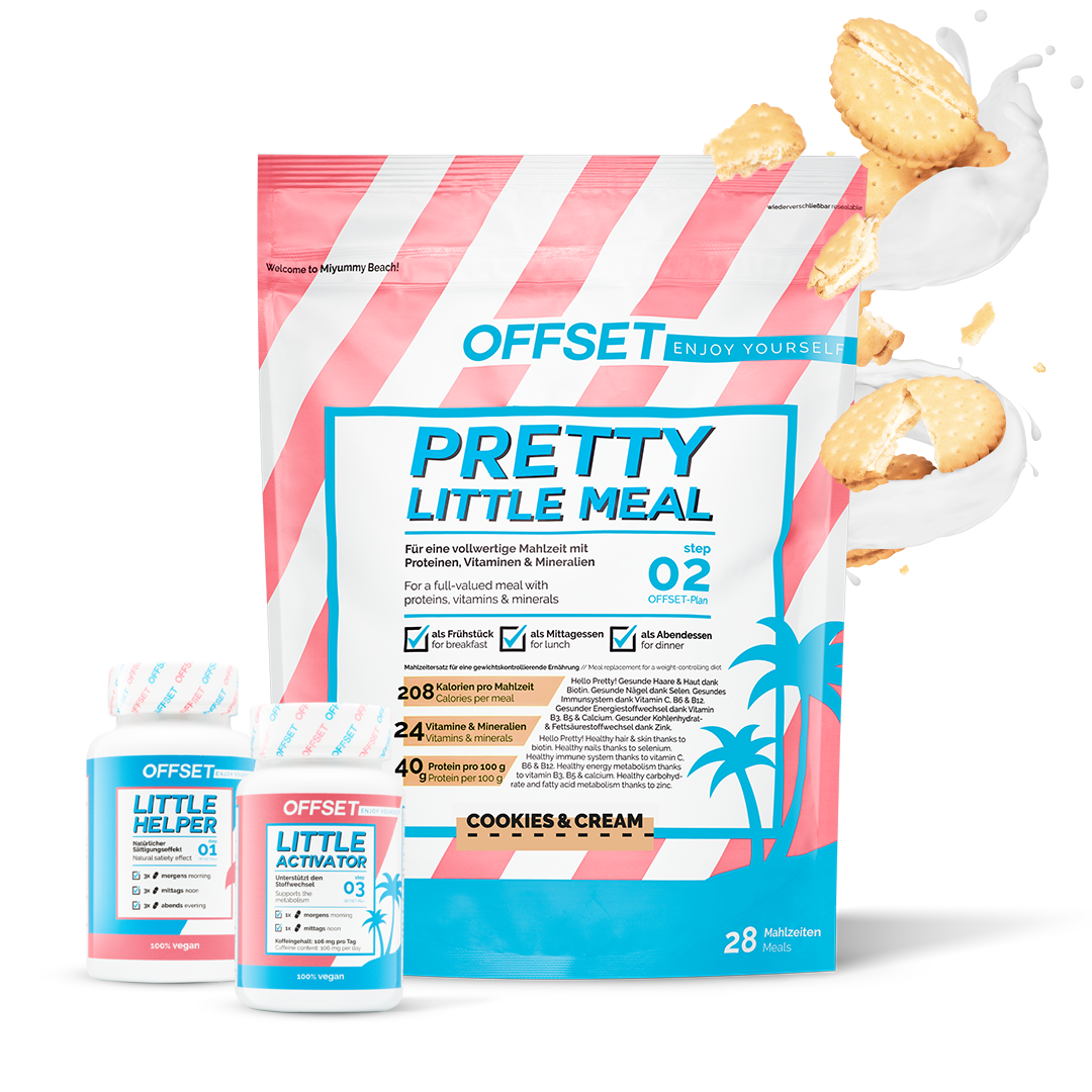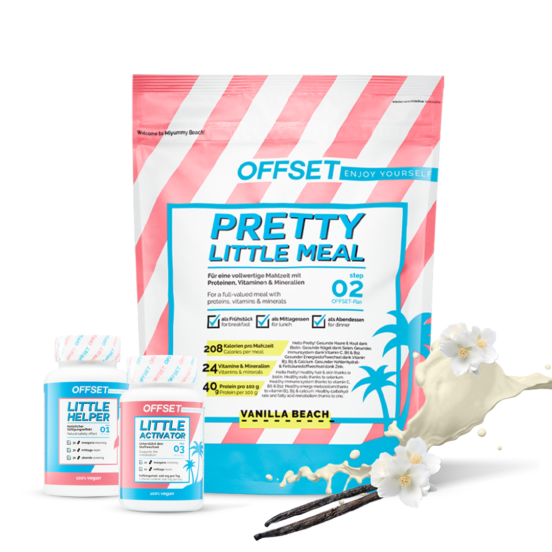 Pretty Little Meal - ganz schön smart. Während deines OFFSET-Plans unterstützt du deinen Körper, spielend leicht vom Zucker loszukommen. Gleichzeitig erhältst du alle wichtigen Mikro- und Makronährstoffe, die dein Körper benötigt. In Kombination mit deinem leckeren Mixed Meal erzielst du dein Pretty New Me.