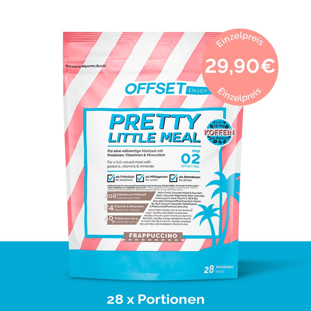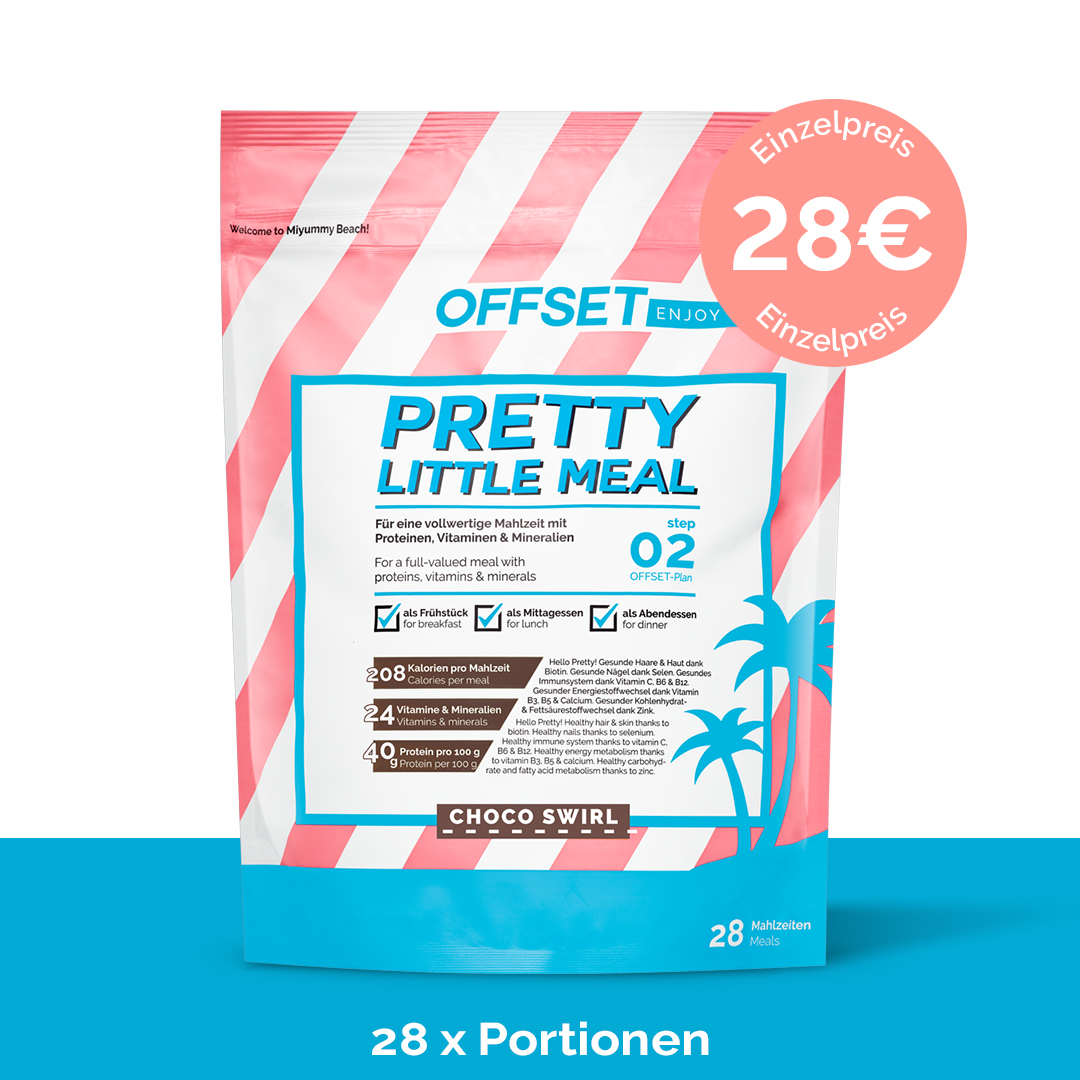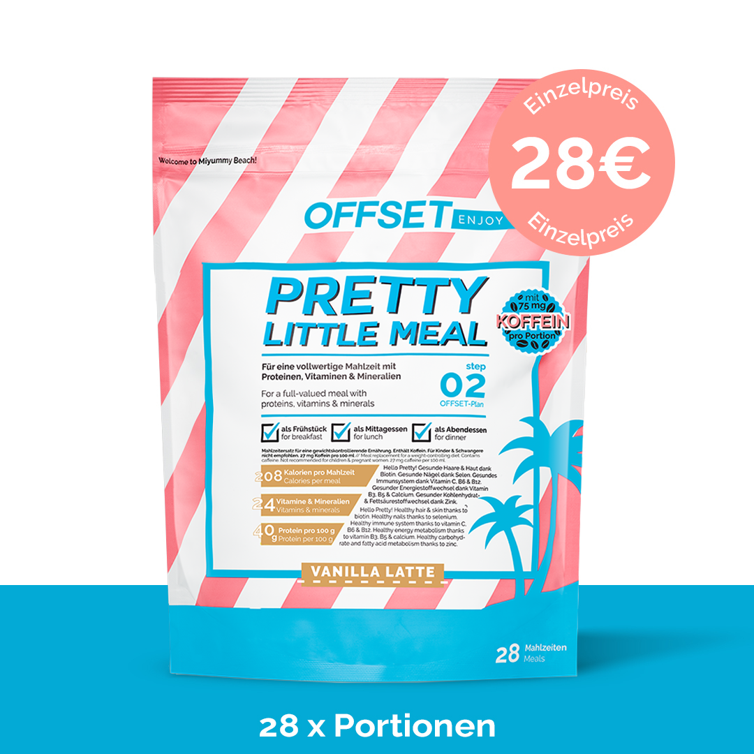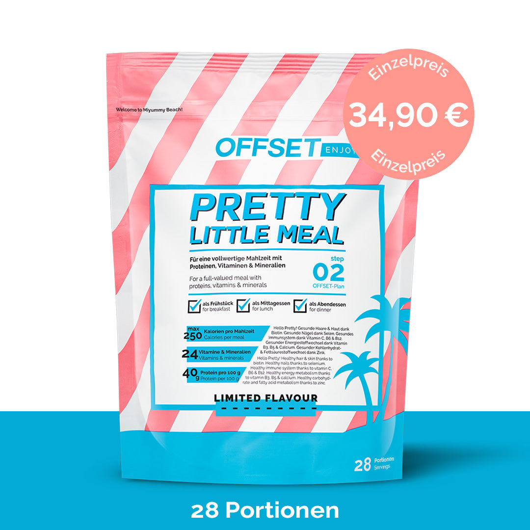 Das Pretty Little Meal enthält Pulver zur Zubereitung von 28 Mahlzeiten. Folgst du dem 2-Wochen-OFFSET-Plan, reicht es für 2 Wochen. Du kannst das Pretty Little Meal aber auch zum Ausgleichen einer kalorienreichen Mahlzeit verwenden und kommst so auch länger aus.