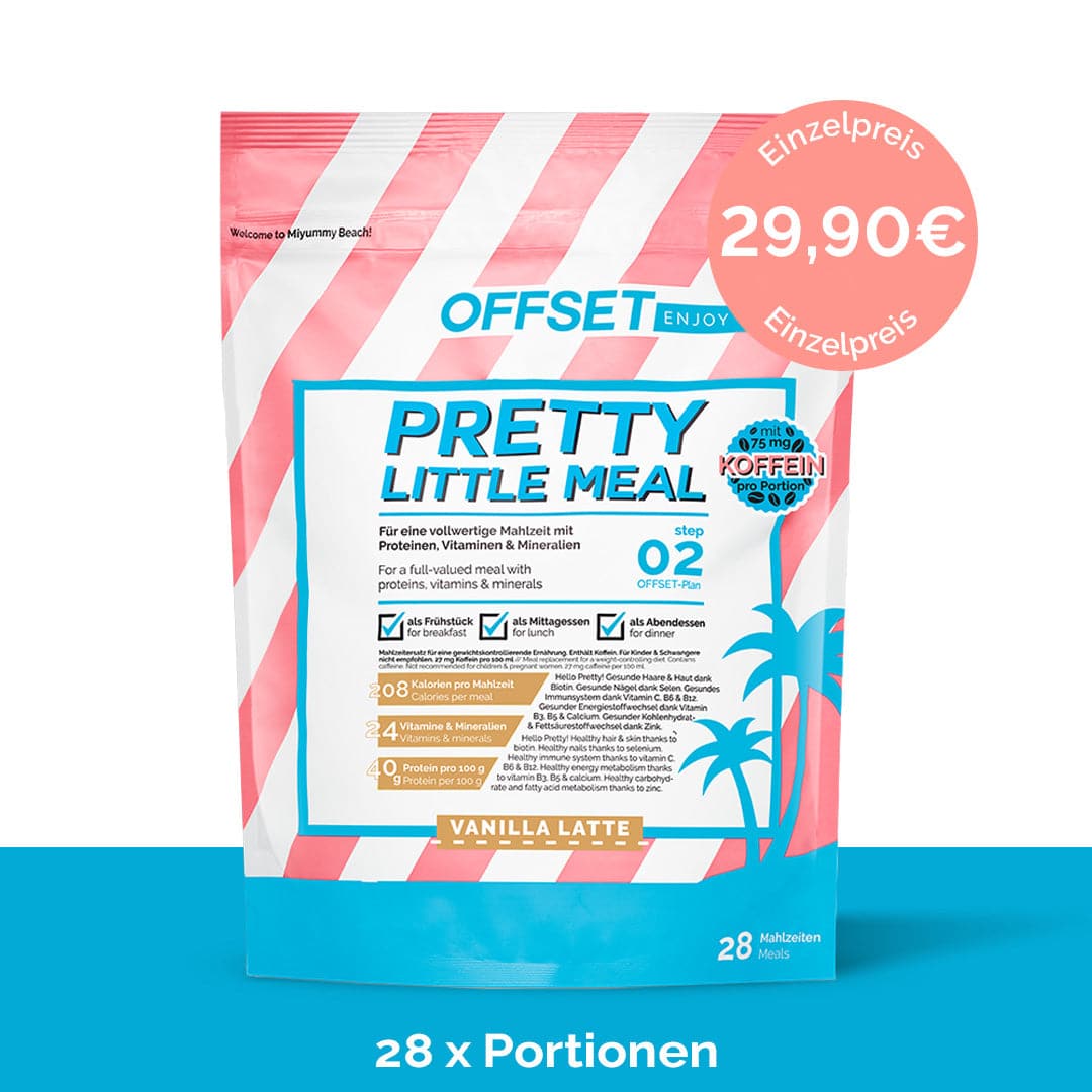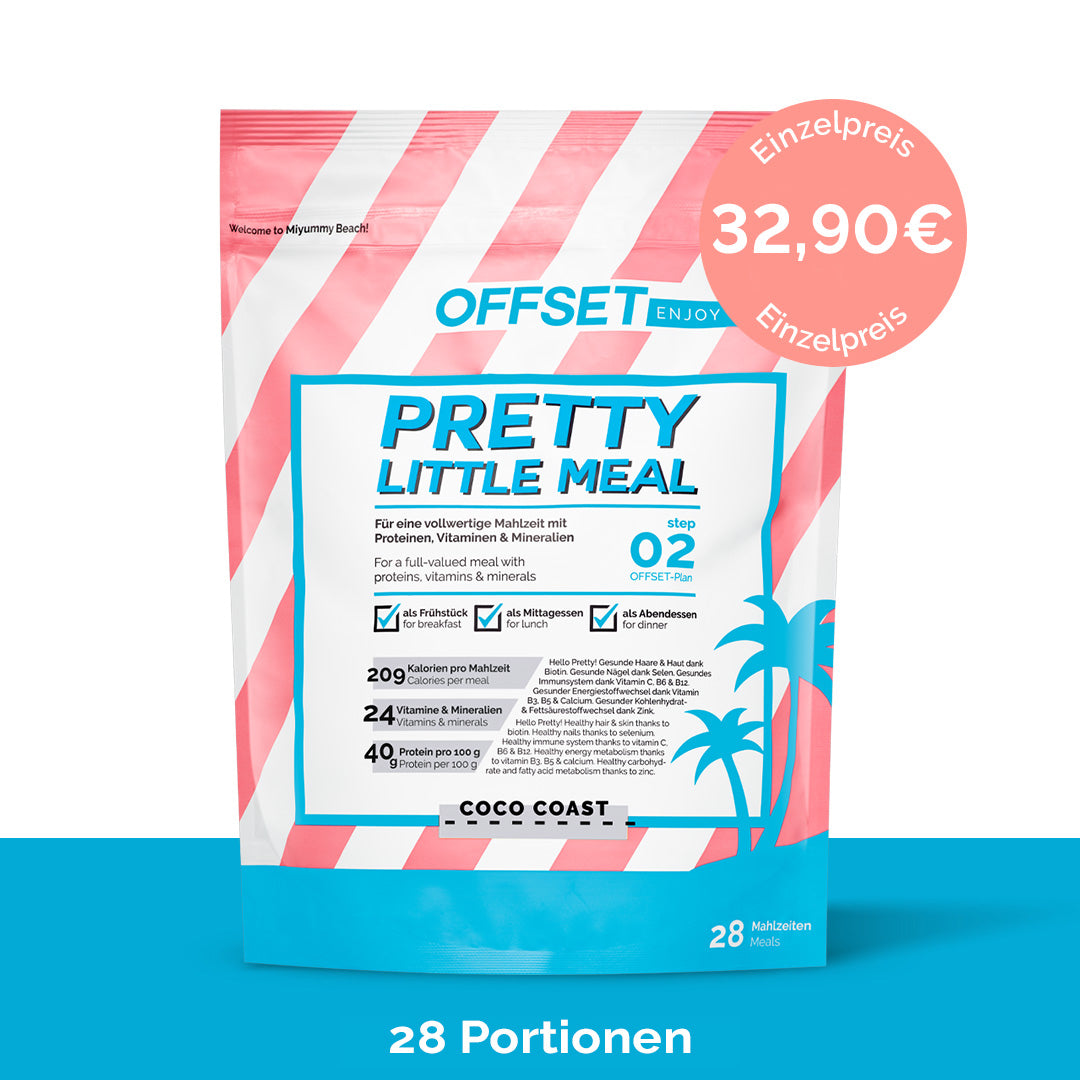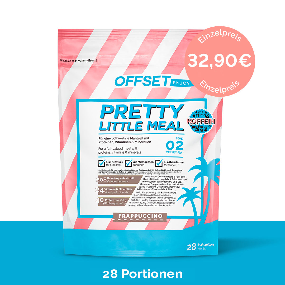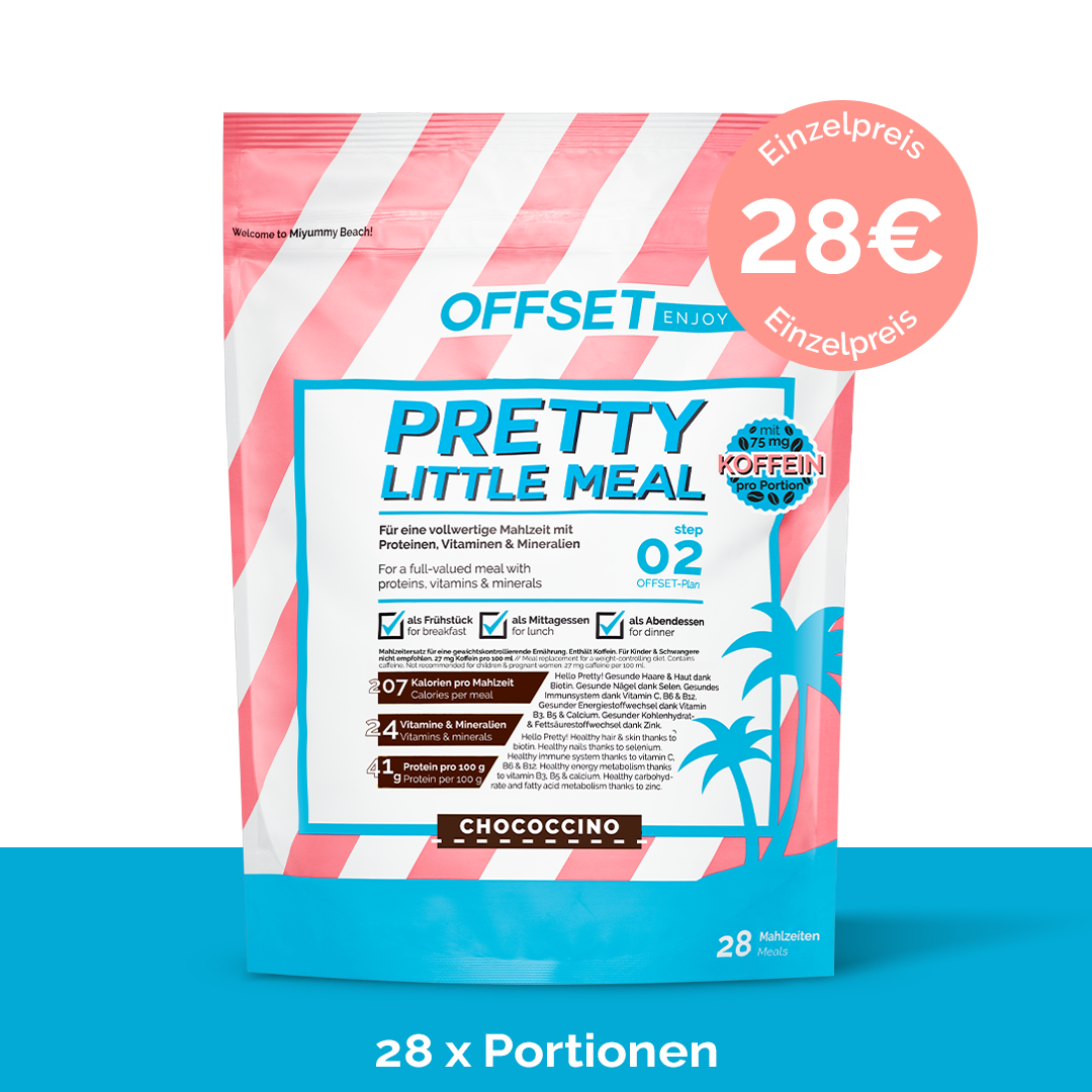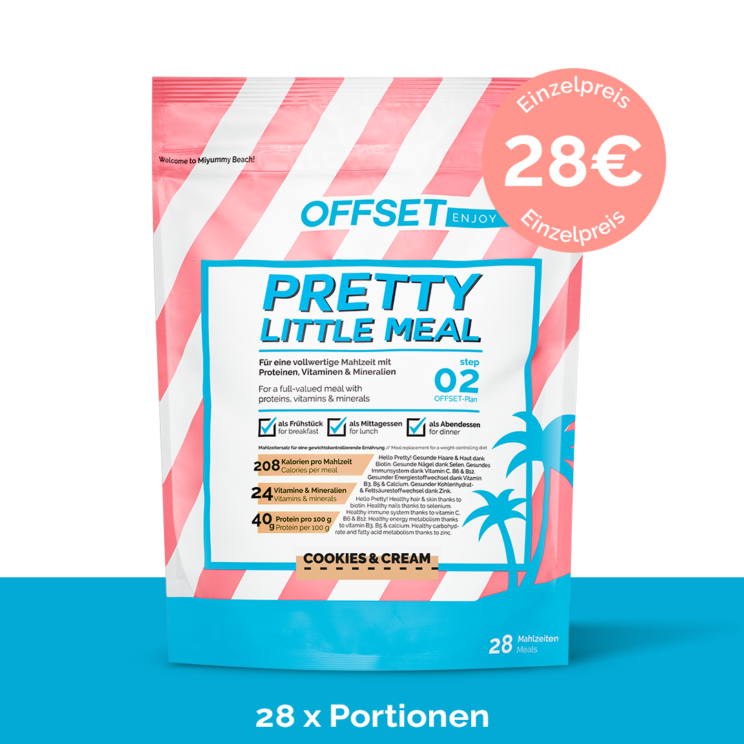 Das Pretty Little Meal enthält Pulver zur Zubereitung von 28 Mahlzeiten. Folgst du dem 2-Wochen-OFFSET-Plan, reicht es für 2 Wochen. Du kannst das Pretty Little Meal aber auch zum Ausgleichen einer kalorienreichen Mahlzeit verwenden und kommst so auch länger aus.