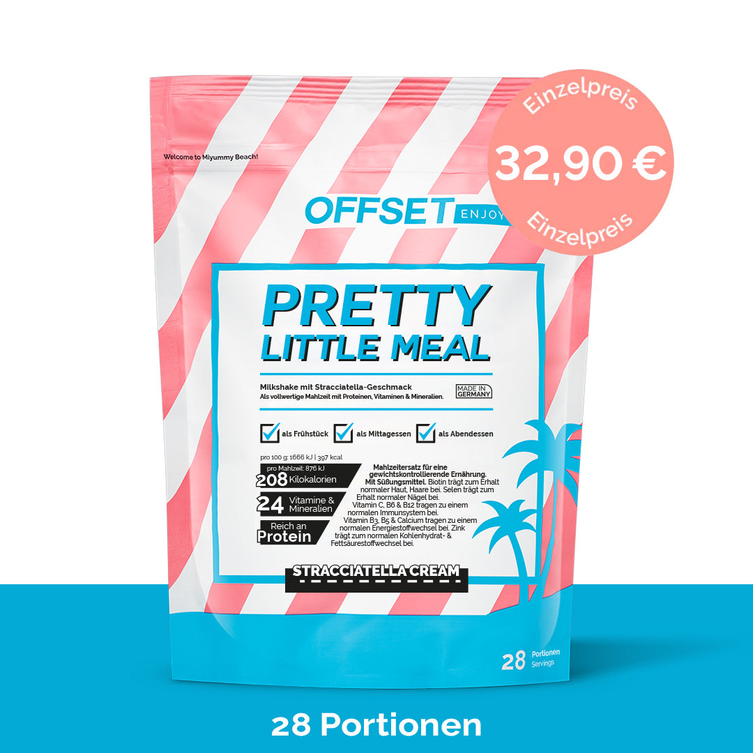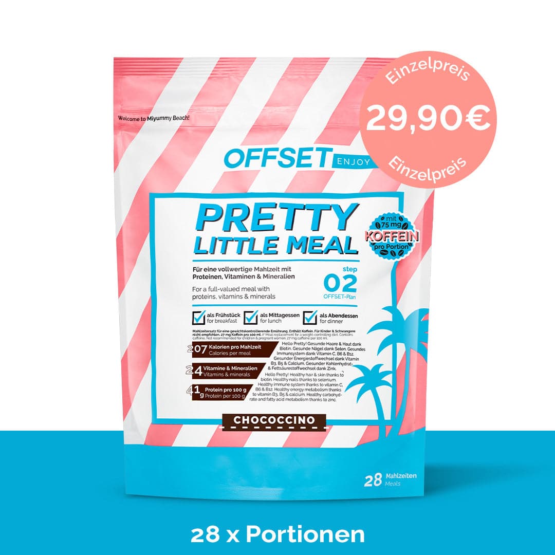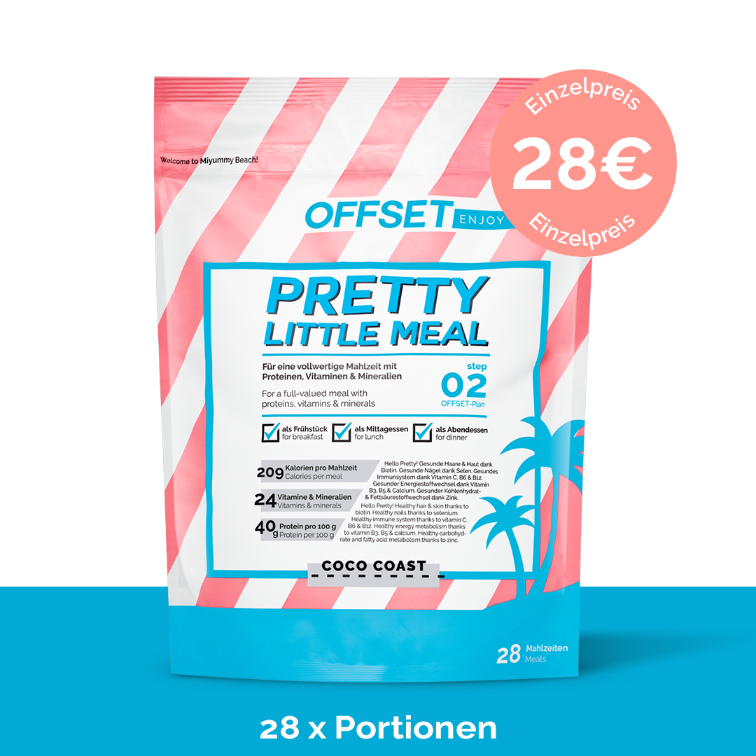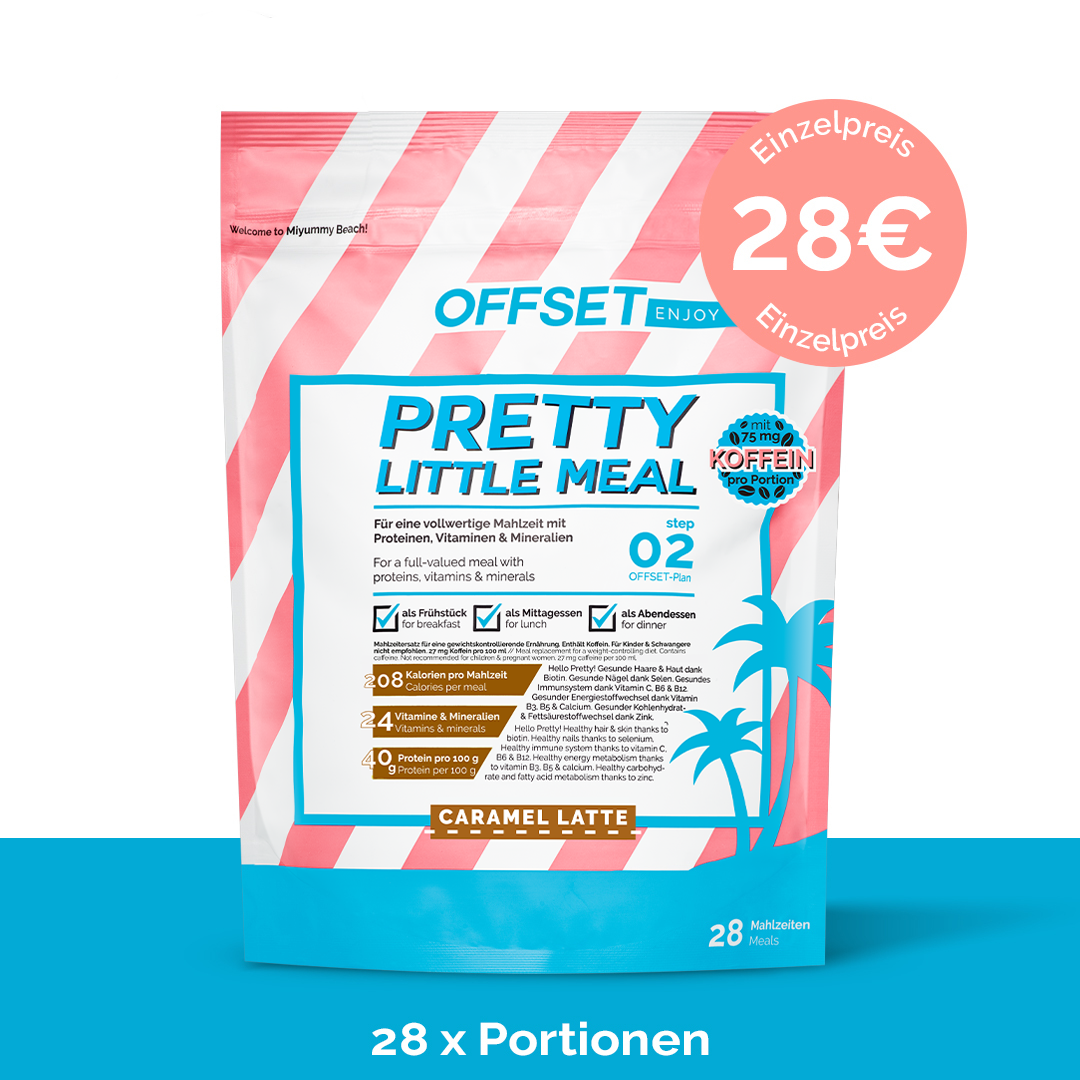Das Pretty Little Meal enthält Pulver zur Zubereitung von 28 Mahlzeiten. Folgst du dem 2-Wochen-OFFSET-Plan, reicht es für 2 Wochen. Du kannst das Pretty Little Meal aber auch zum Ausgleichen einer kalorienreichen Mahlzeit verwenden und kommst so auch länger aus.