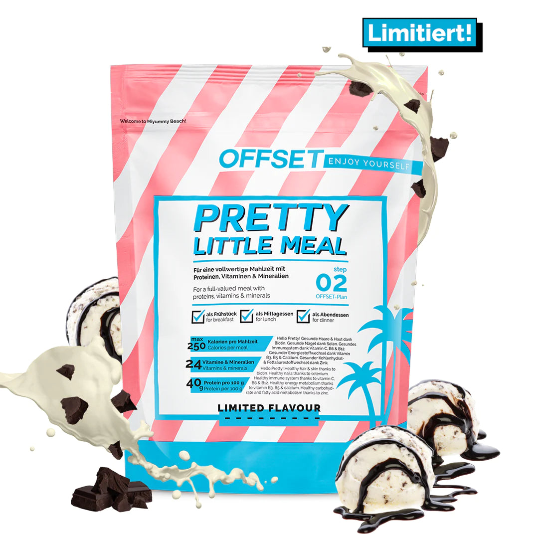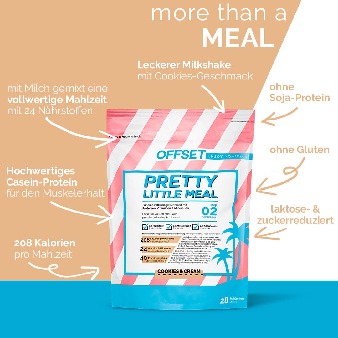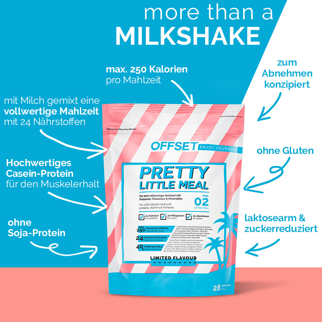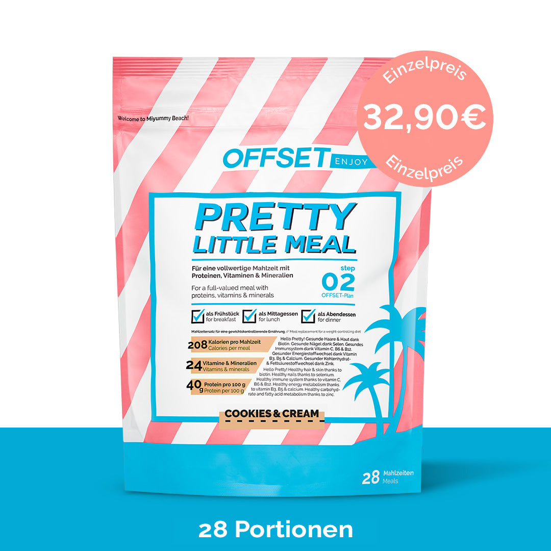- Das Ersetzen von 2 Hauptmahlzeiten am Tag durch je eine Pretty Little Meal-Mahlzeit trägt im Rahmen einer kalorienarmen Ernährung, wie unserem OFFSET-Plan, dazu bei Gewicht zu verlieren.