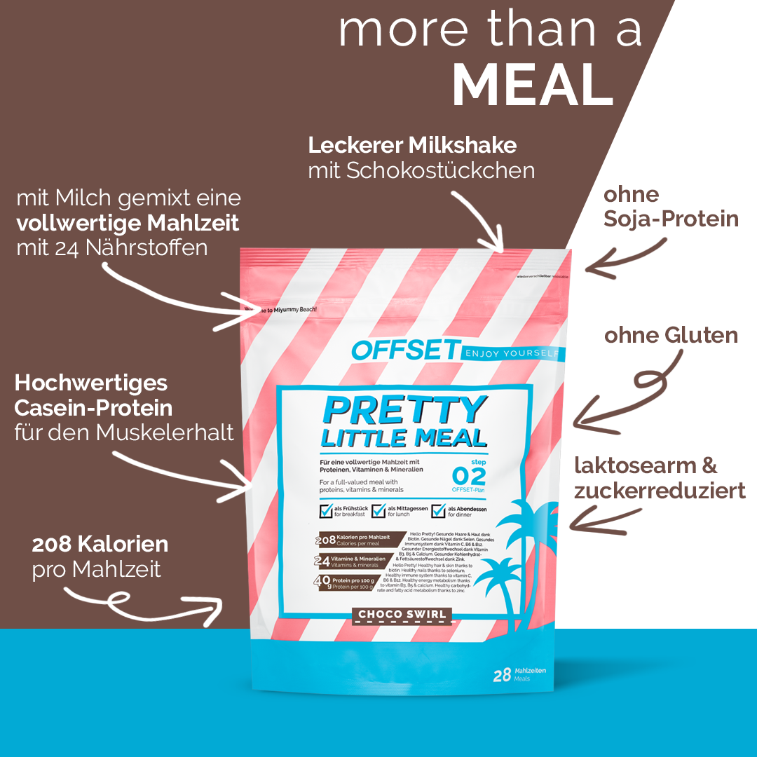 wenn du 2 Hauptmahlzeiten am Tag mit je einer Pretty Little Meal-Mahlzeit im Rahmen einer kalorienarmen Ernährung, wie unserem OFFSET-Plan, ersetzt.