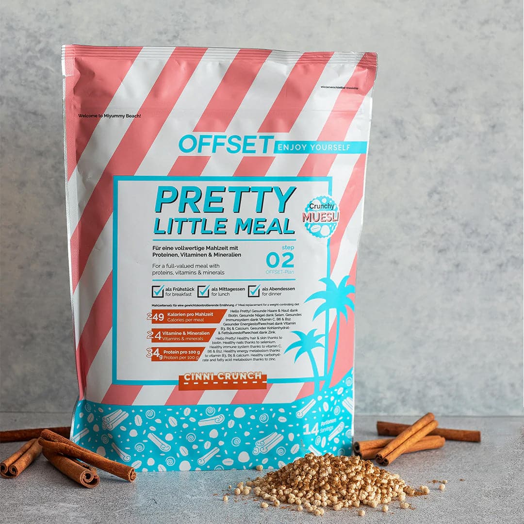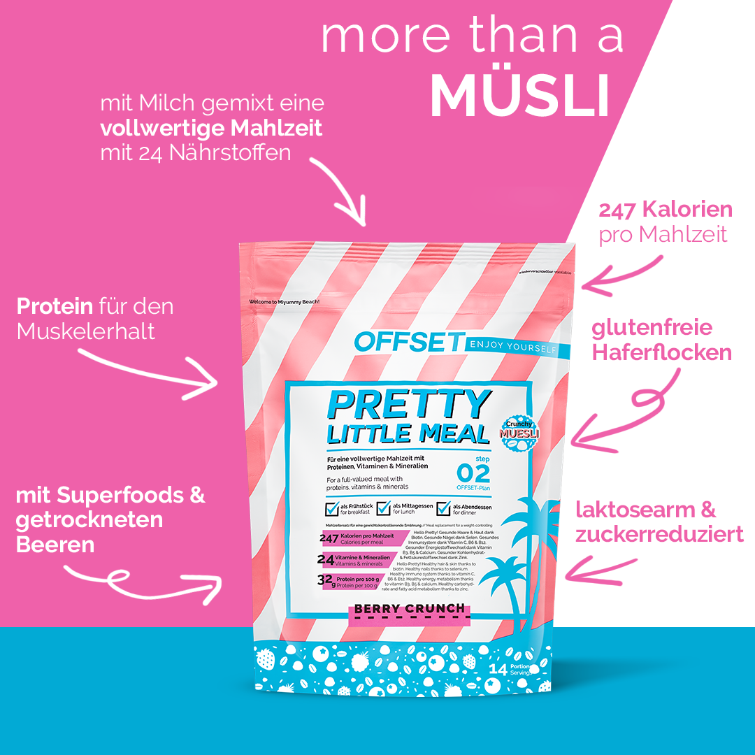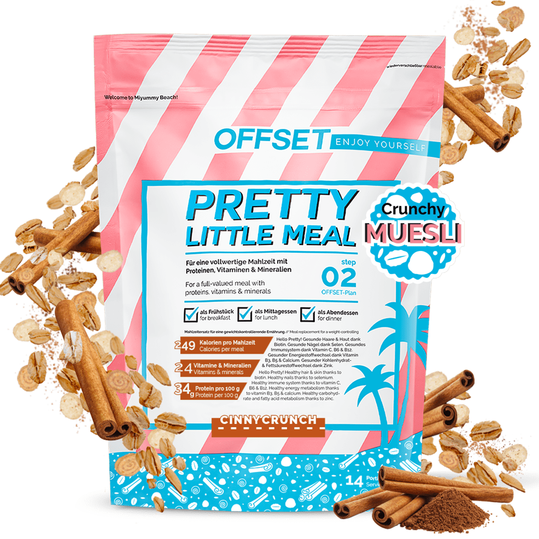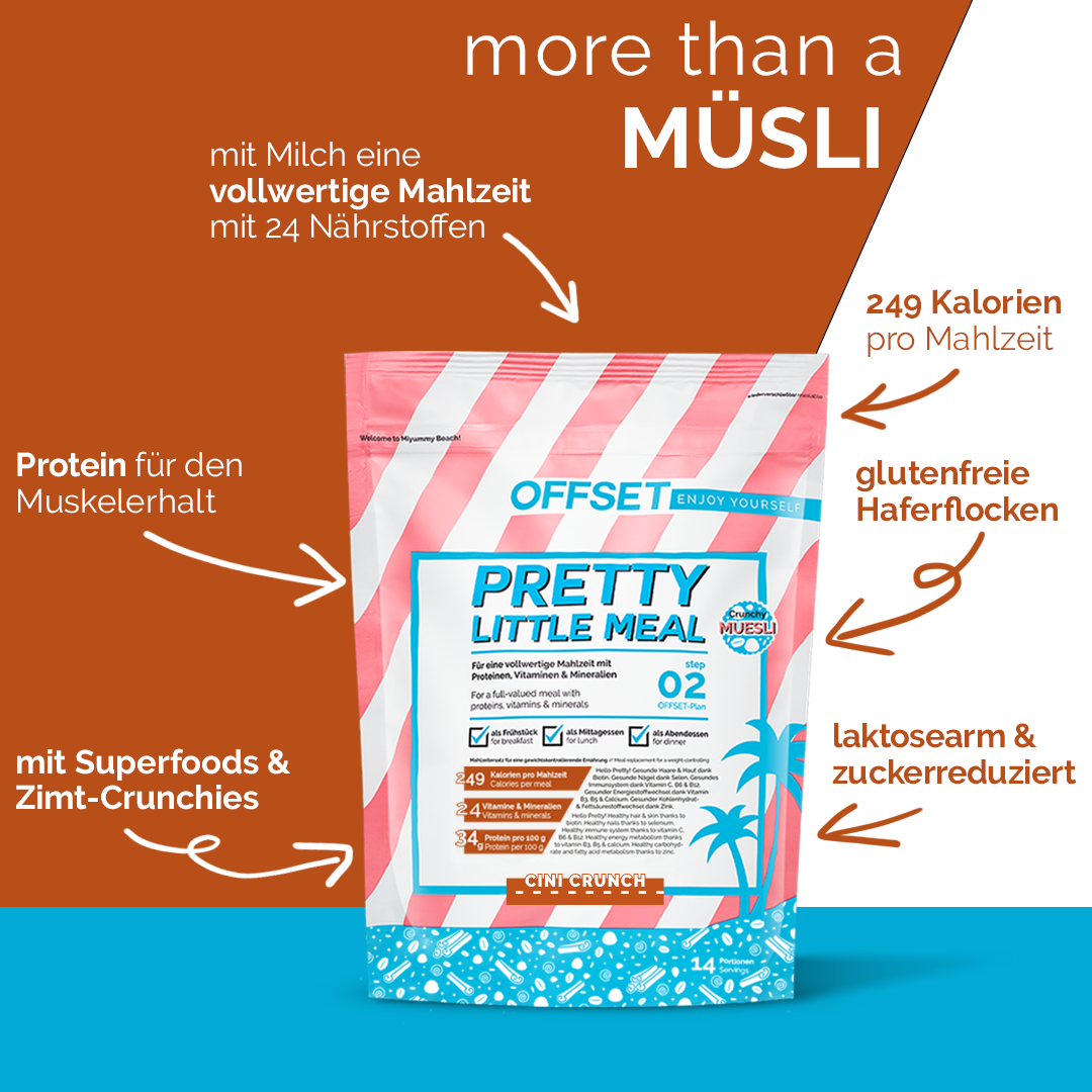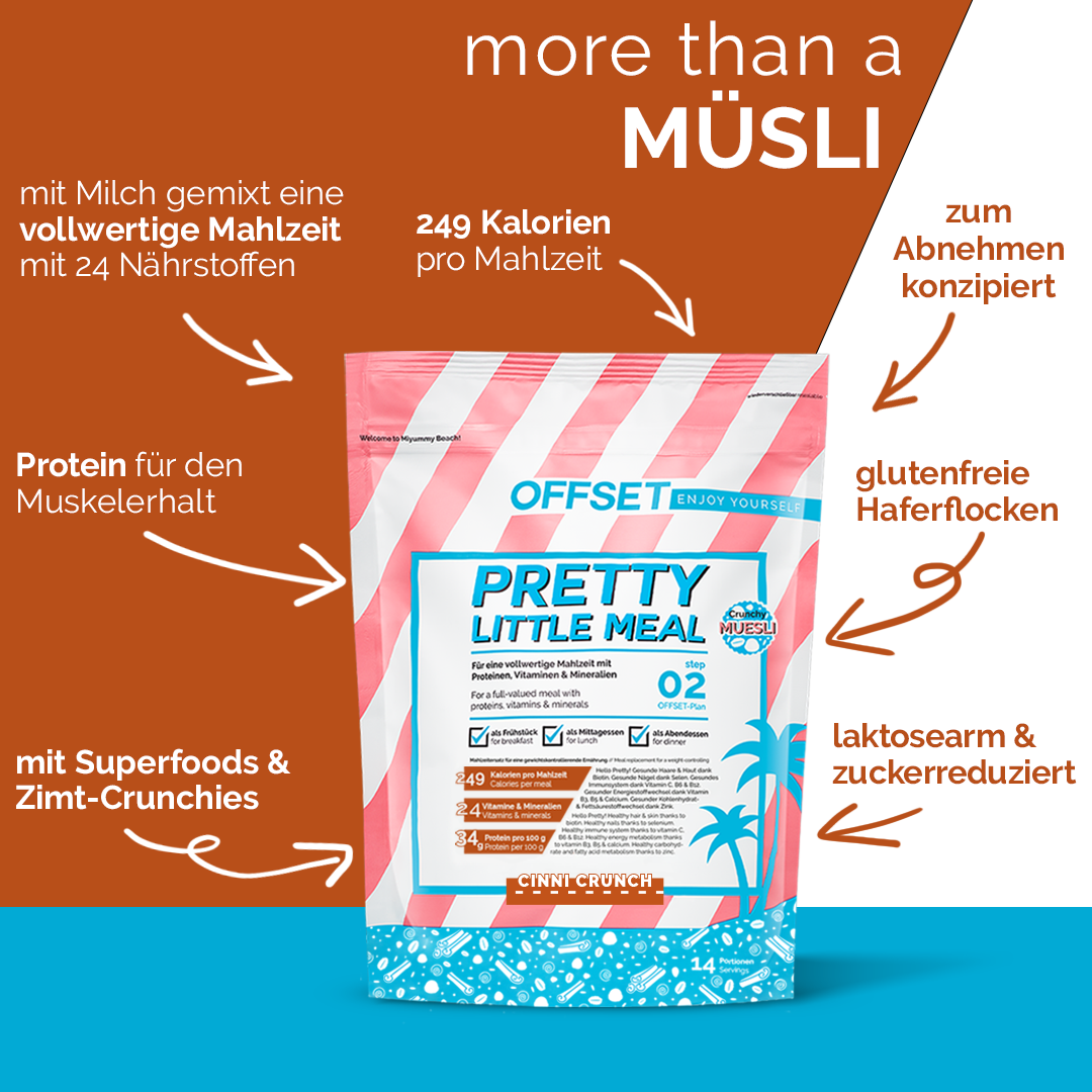 Das Pretty Little Meal Muesli enthält den Müsli-Mix zur Zubereitung von 14 Mahlzeiten. Folgst du dem 2-Wochen-OFFSET-Plan reicht eine Packung für 7 Tage während der Burn Days. Für mehr Abwechslung beim OFFSET-Plan sorgt die Kombi aus Pretty Little Meal Muesli mit Pretty Little Meal-Shake, Pretty Little Meal-Porridge oder Pretty Little Meal-Riegel.