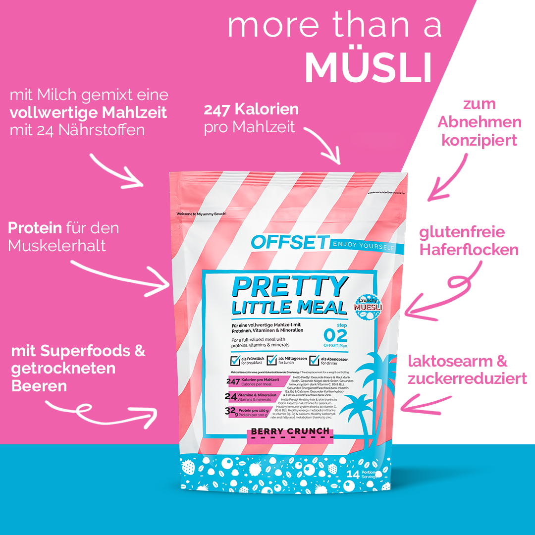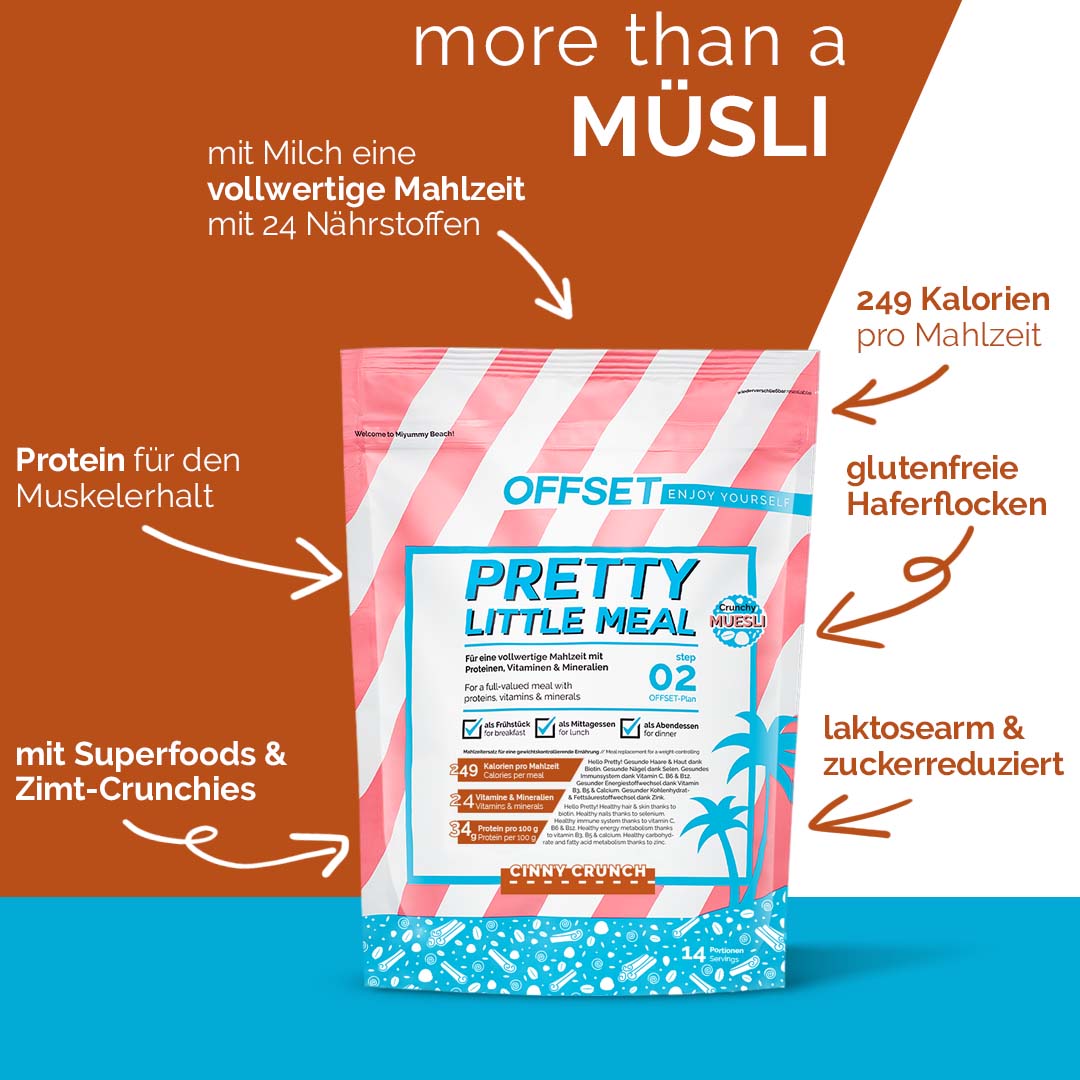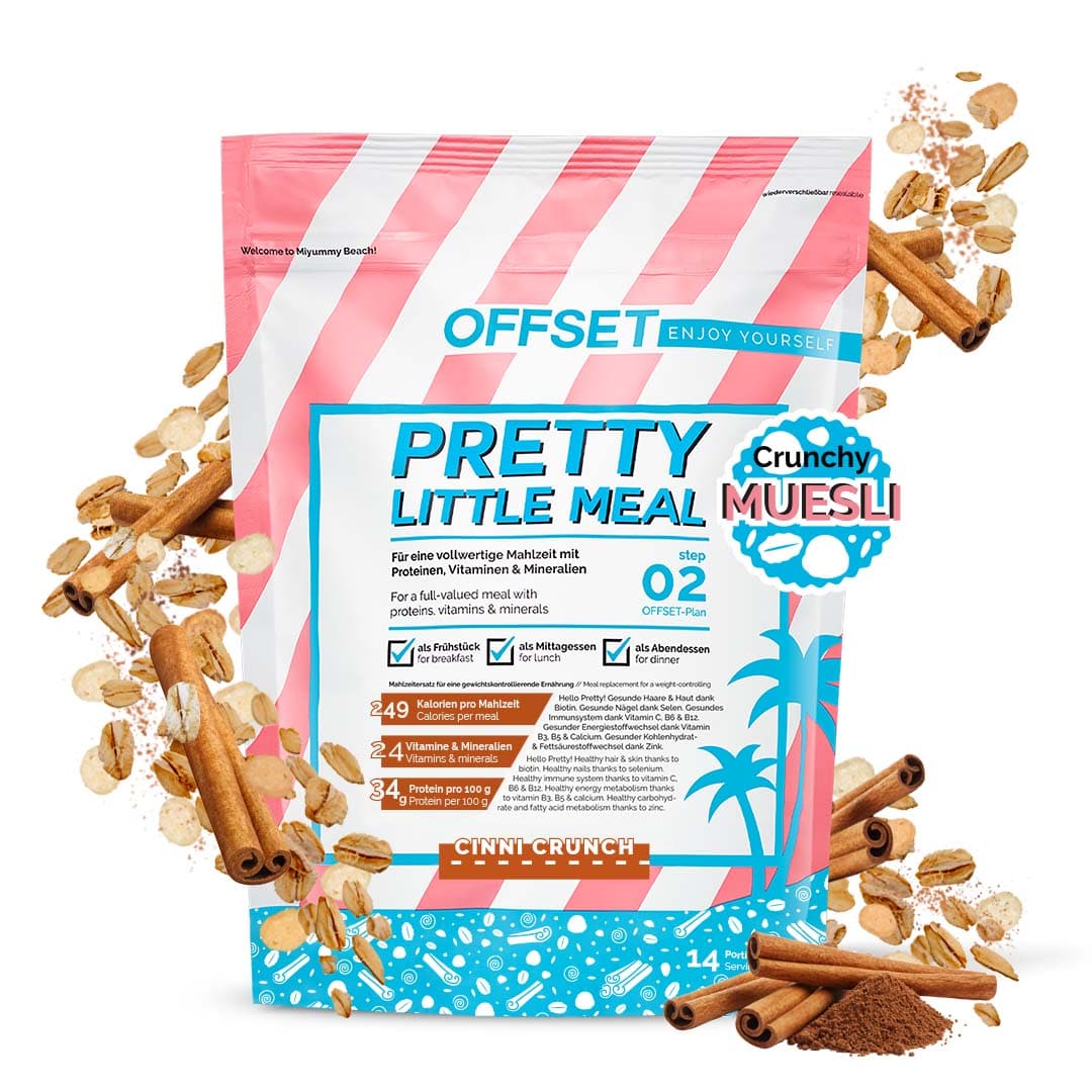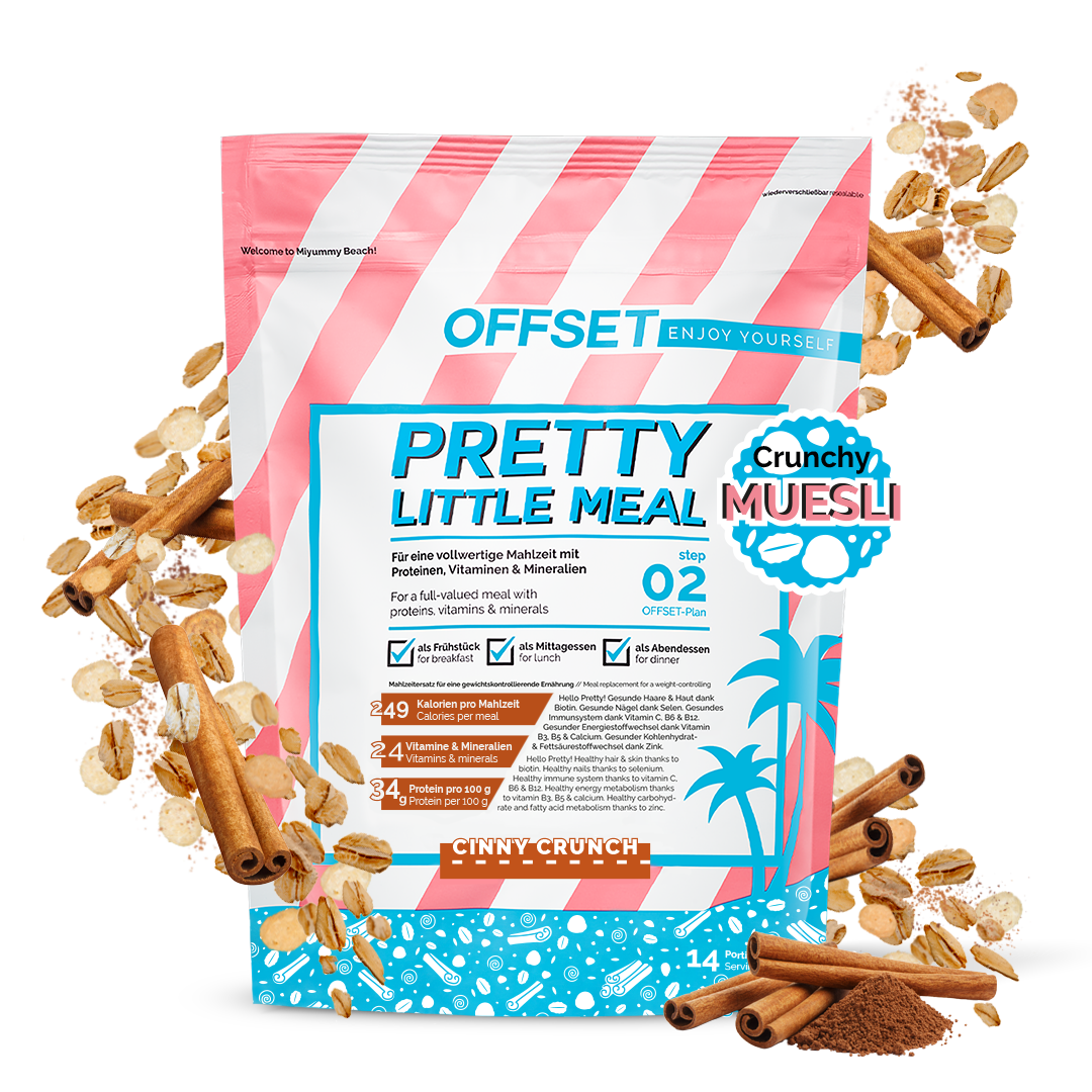 Das Pretty Little Meal Muesli enthält den Müsli-Mix zur Zubereitung von 14 Mahlzeiten. Folgst du dem 2-Wochen-OFFSET-Plan reicht eine Packung für 7 Tage während der Burn Days. Für mehr Abwechslung beim OFFSET-Plan sorgt die Kombi aus Pretty Little Meal Muesli mit Pretty Little Meal-Shake, Pretty Little Meal-Porridge oder Pretty Little Meal-Riegel.
