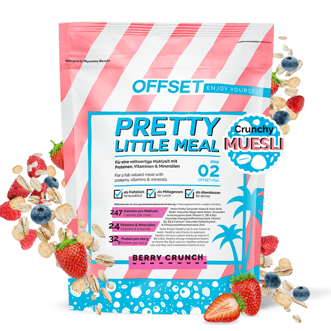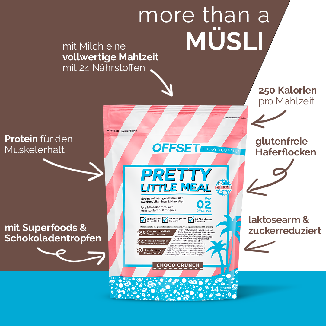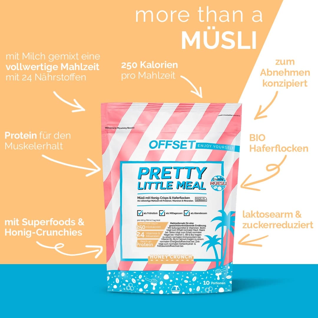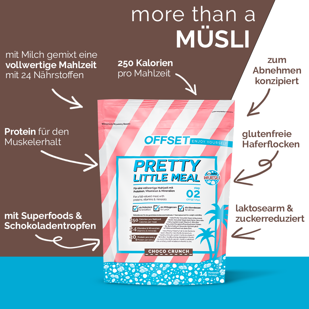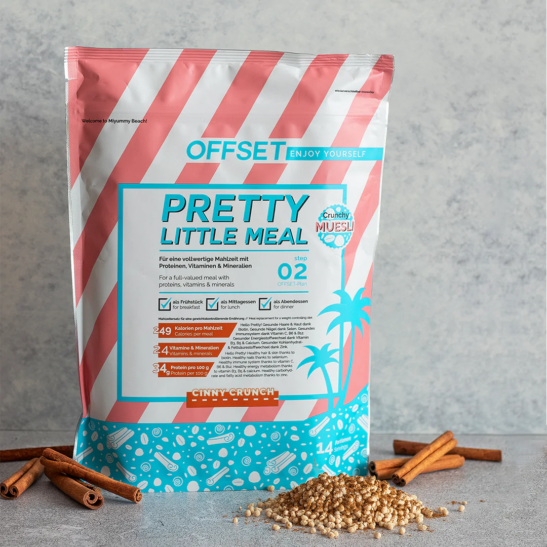 Das Pretty Little Meal Muesli enthält den Müsli-Mix zur Zubereitung von 14 Mahlzeiten. Folgst du dem 2-Wochen-OFFSET-Plan reicht eine Packung für 7 Tage während der Burn Days. Für mehr Abwechslung beim OFFSET-Plan sorgt die Kombi aus Pretty Little Meal Muesli mit Pretty Little Meal-Shake, Pretty Little Meal-Porridge oder Pretty Little Meal-Riegel.