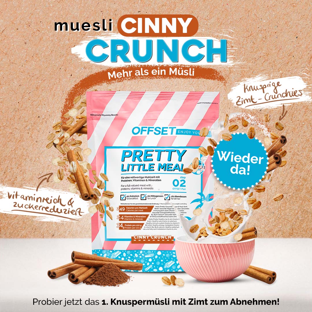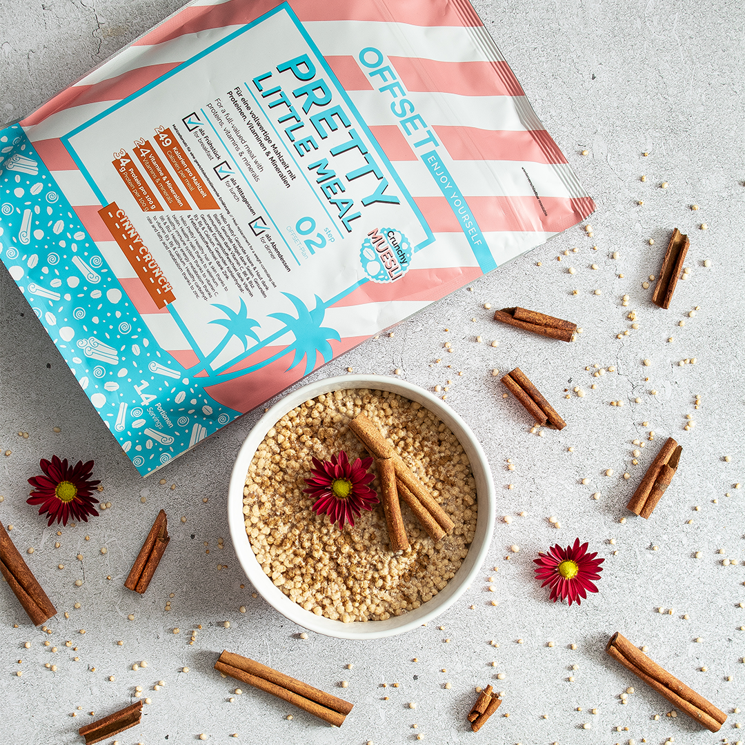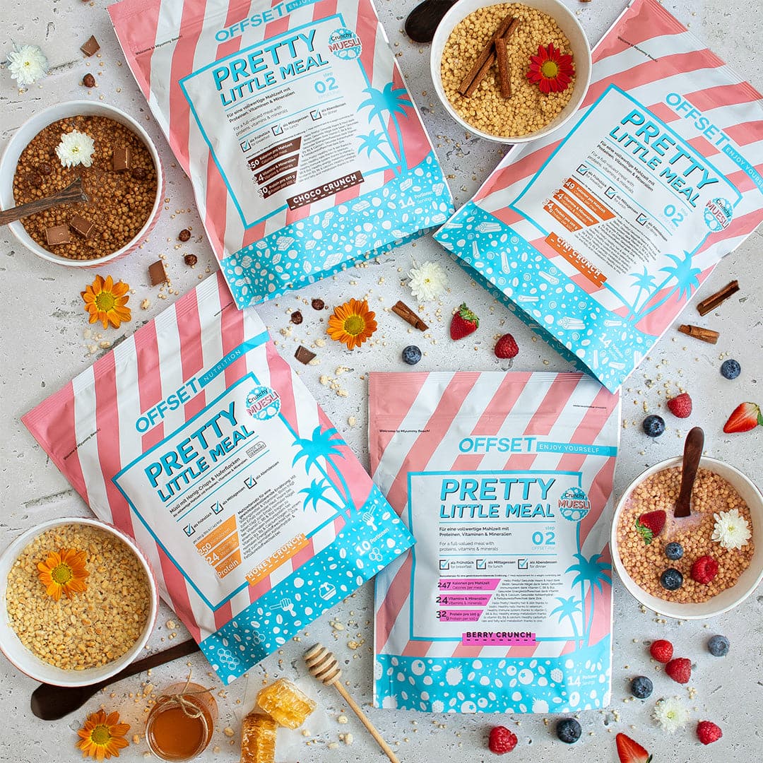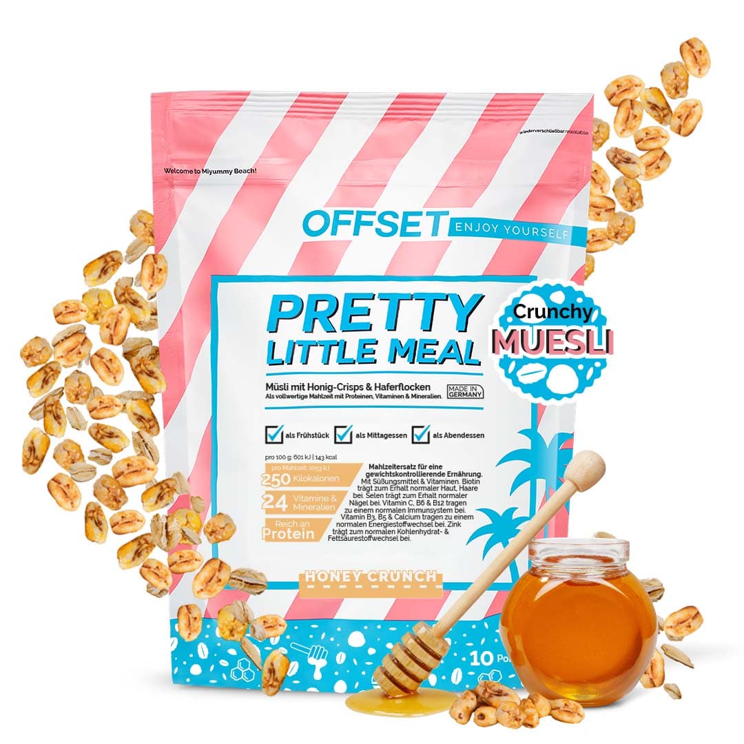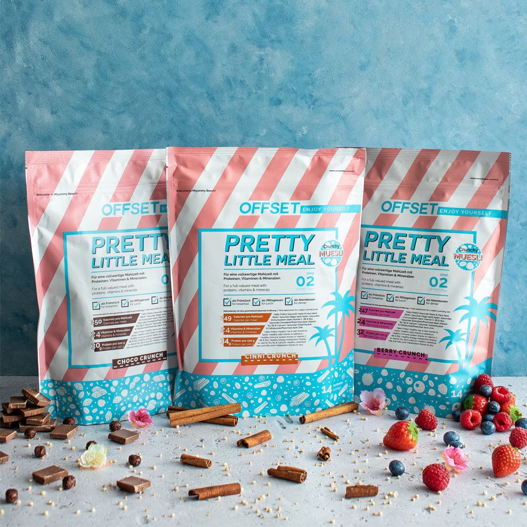 Das Pretty Little Meal Muesli enthält den Müsli-Mix zur Zubereitung von 14 Mahlzeiten. Folgst du dem 2-Wochen-OFFSET-Plan reicht eine Packung für 7 Tage während der Burn Days. Für mehr Abwechslung beim OFFSET-Plan sorgt die Kombi aus Pretty Little Meal Muesli mit Pretty Little Meal-Shake, Pretty Little Meal-Porridge oder Pretty Little Meal-Riegel.