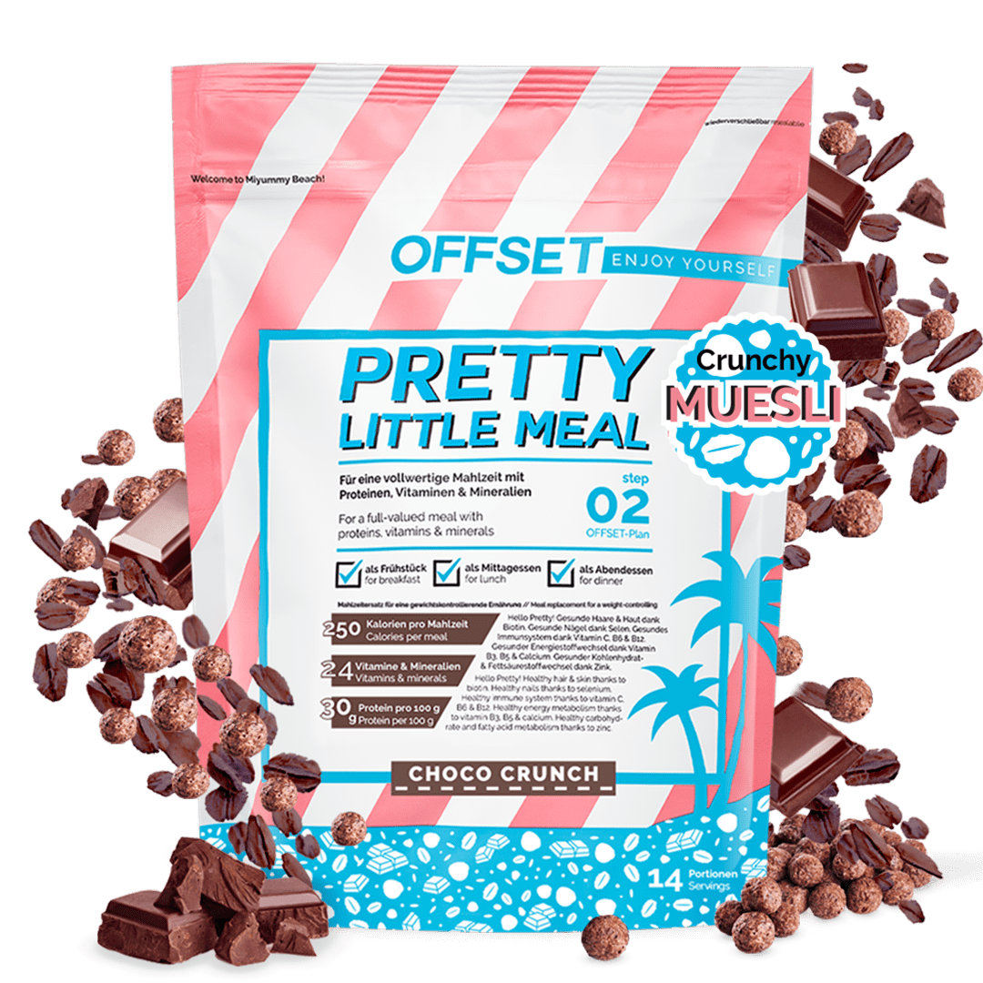 Pretty Little Meal erfüllt nur in diesem Rahmen ihren angestrebten Zweck. Andere Lebensmittel müssen Teil dieser Ernährung sein. Schaue dafür auch in unsere kostenlose OFFSET-App mit vielen leckeren Rezepten für Mixed Meals. Trinke dazu täglich 2-3 Liter Wasser. Um abzunehmen, sollten täglich zwei Hauptmahlzeiten durch je eine Pretty Little Meal-Mahlzeit ersetzt werden. Um das Gewicht zu halten, sollte täglich eine Hauptmahlzeit durch eine Pretty Little Meal-Mahlzeit ersetzt werden.