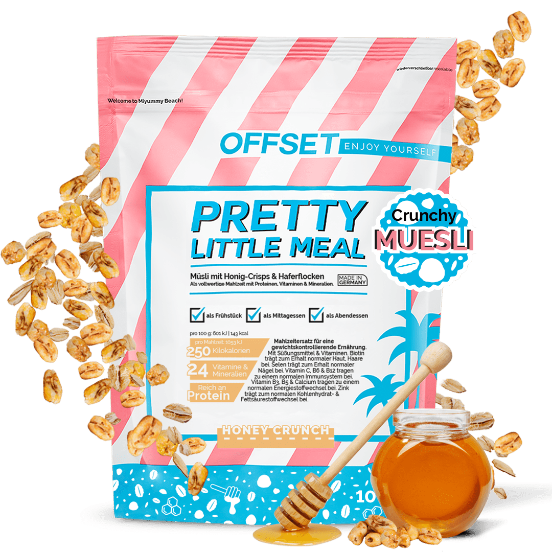 Pretty Little Meal erfüllt nur in diesem Rahmen ihren angestrebten Zweck. Andere Lebensmittel müssen Teil dieser Ernährung sein. Schaue dafür auch in unsere kostenlose OFFSET-App mit vielen leckeren Rezepten für Mixed Meals. Trinke dazu täglich 2-3 Liter Wasser.
