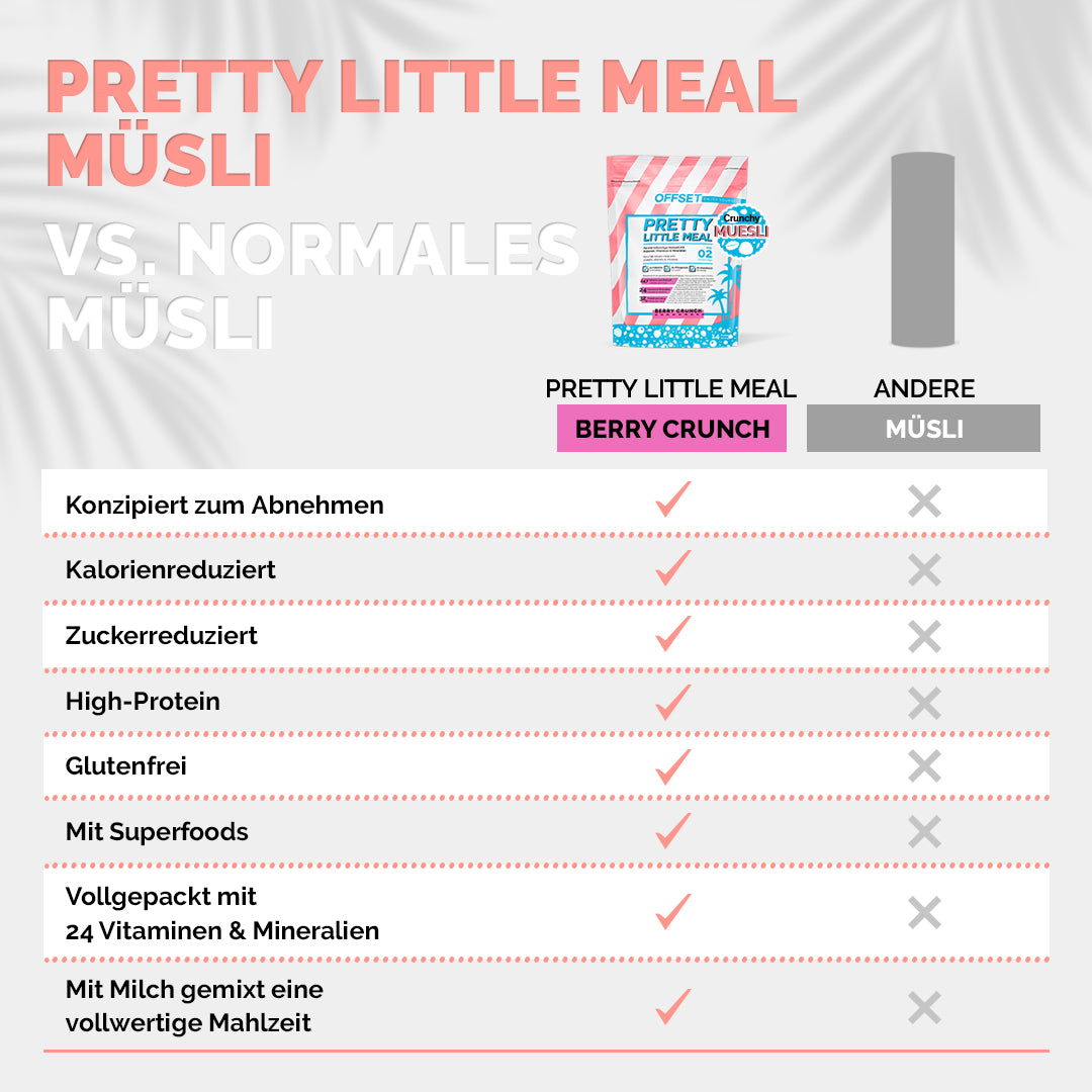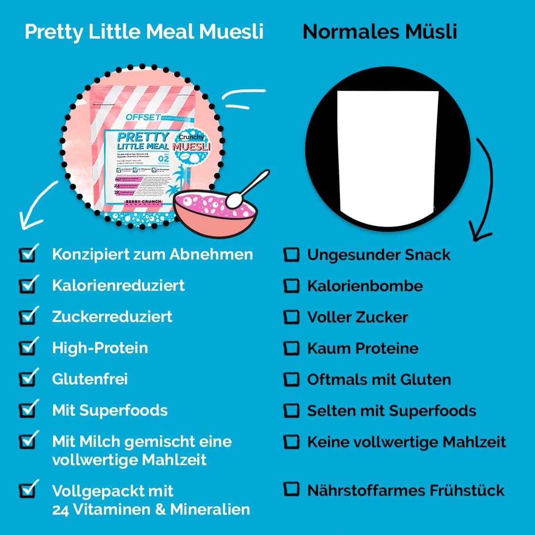 Unser Pretty Little Meal Muesli ist, im Vergleich zu herkömmlichen Müsli-Produkten aus dem Supermarkt, mit Milch angerührt eine vollwertige Mahlzeit zum Abnehmen oder Gewichthalten. Dazu versorgt dich unser Müsli mit einem hochwertigen Mix aus 24 Vitaminen und Mineralstoffen sowie wichtige Spurenelemente und ist reich an Proteinen. Auf diese Weise wird dein Körper mit einer Portion unseres Müslis mit allen wichtigen Makro- und Mikronährstoffen versorgt.