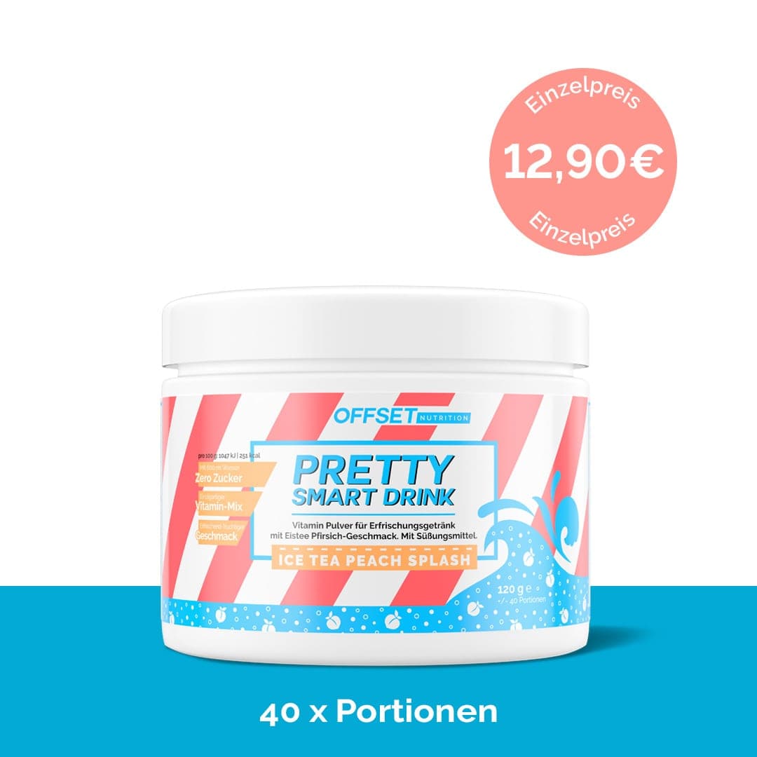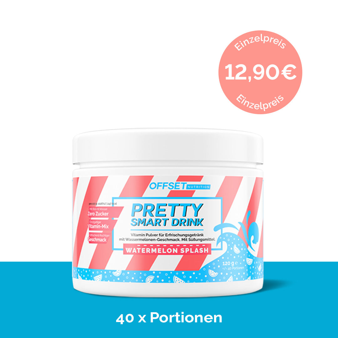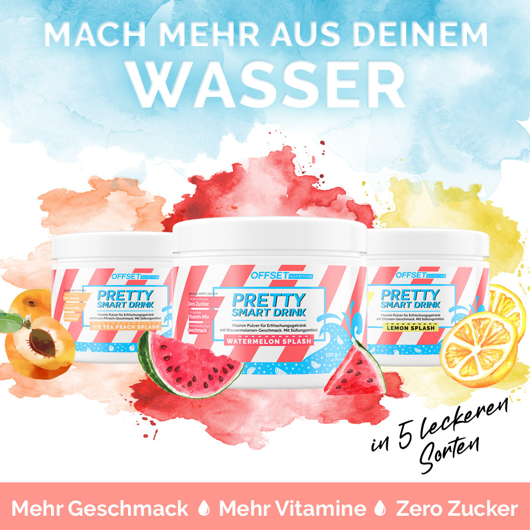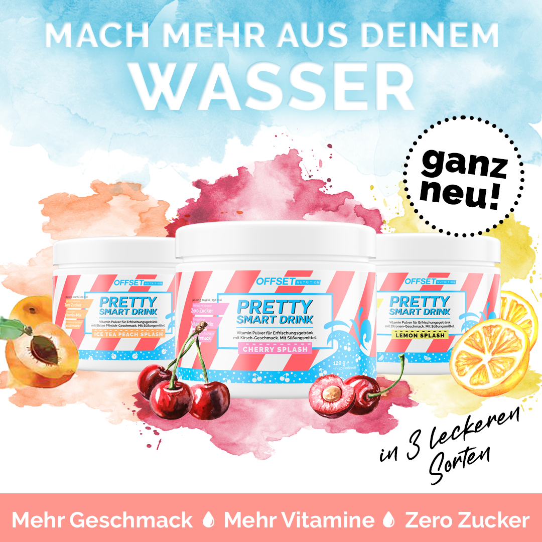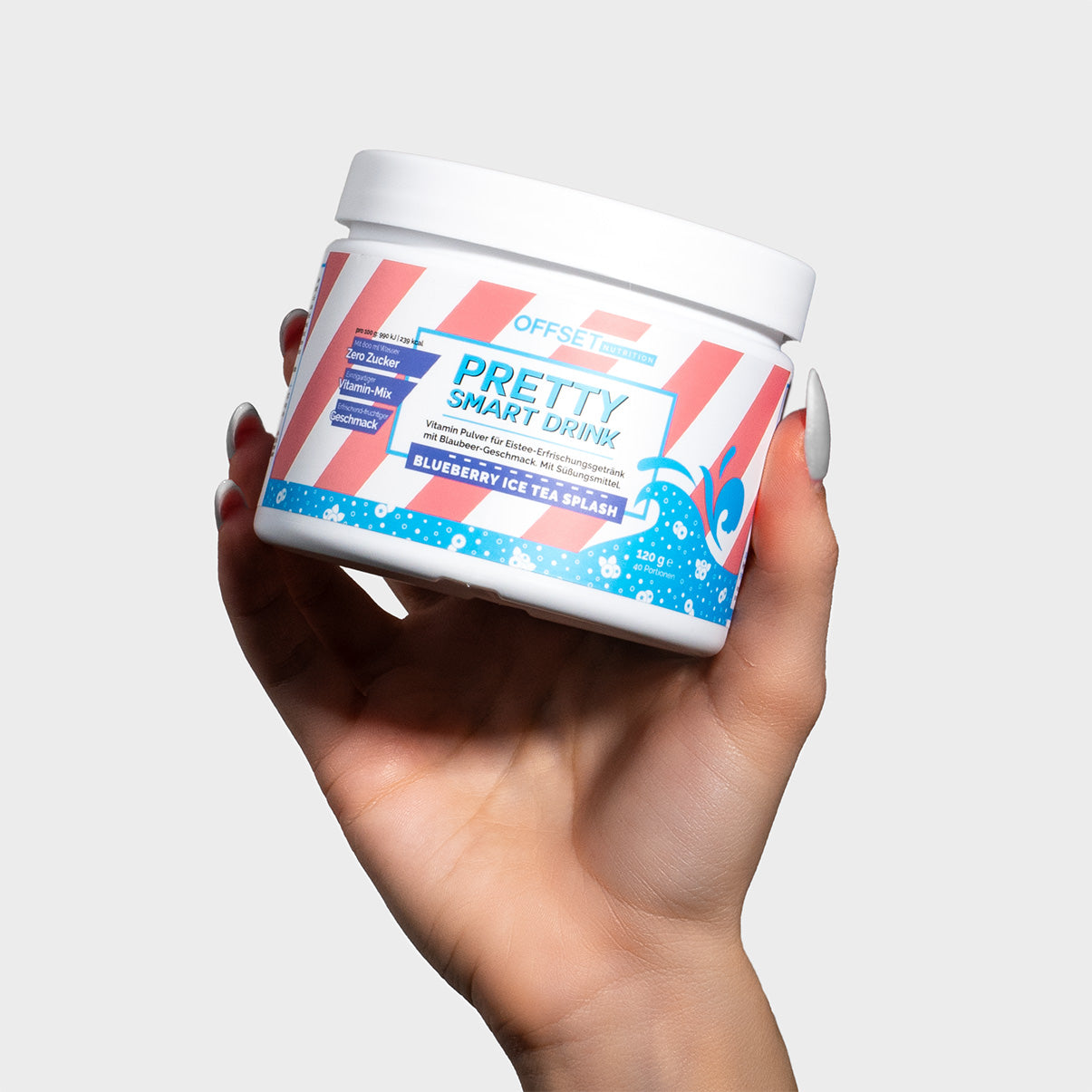 Unser neuer Pretty Smart Drink ist Vitaminpulver, das dein Wasser in eine fruchtige Erfrischung verwandelt! So hilft er dir, mehr zu trinken und passt perfekt in deinen OFFSET-Plan! Der Pretty Smart Drink versorgt dich nicht nur mit 12 wichtigen Vitaminen & Mineralien, er hält auch Premium Ballaststoffe für ein gutes Bauchgefühl bereit! Du kannst den Pretty Smart Drink ganz nach deinem Geschmack dosieren und mixen.