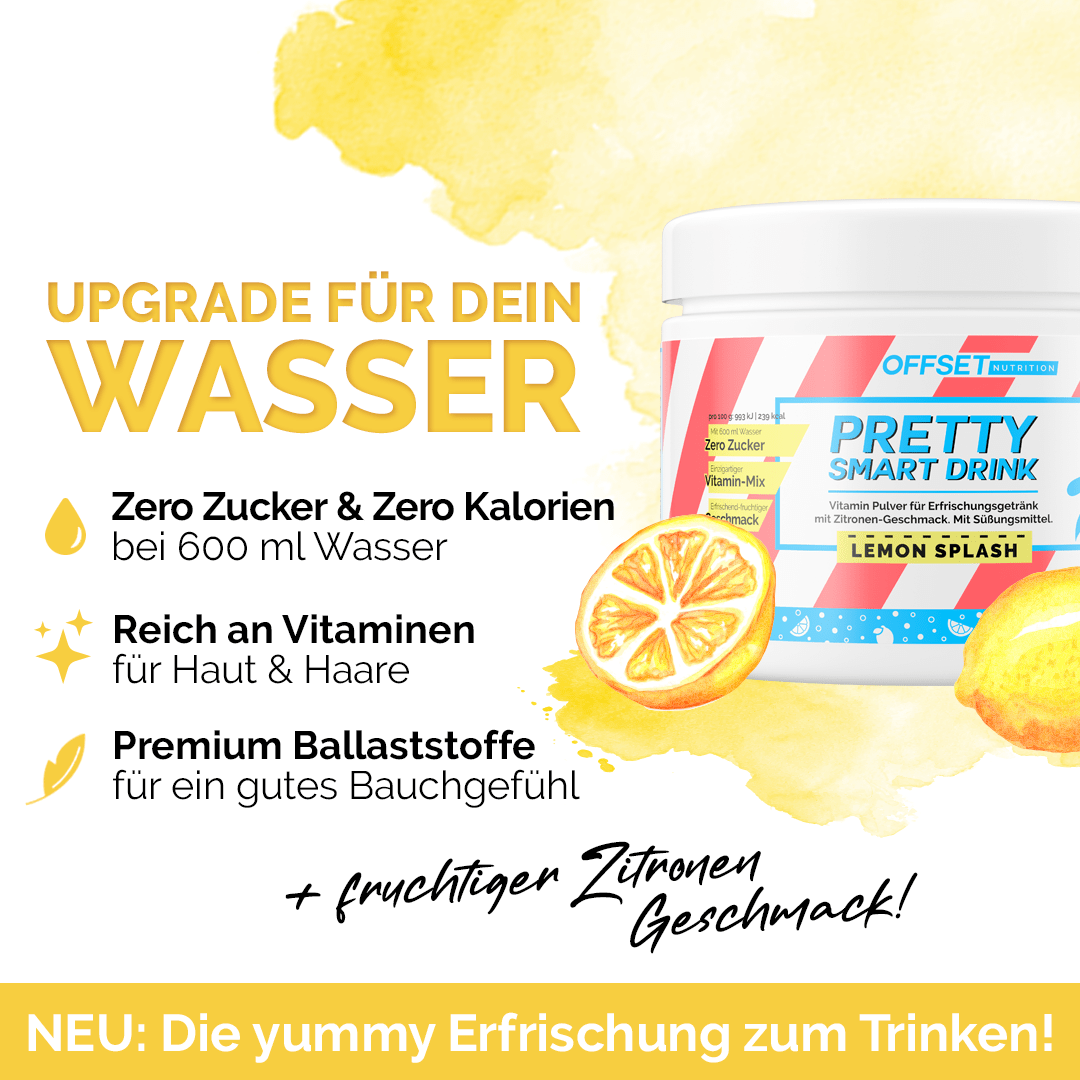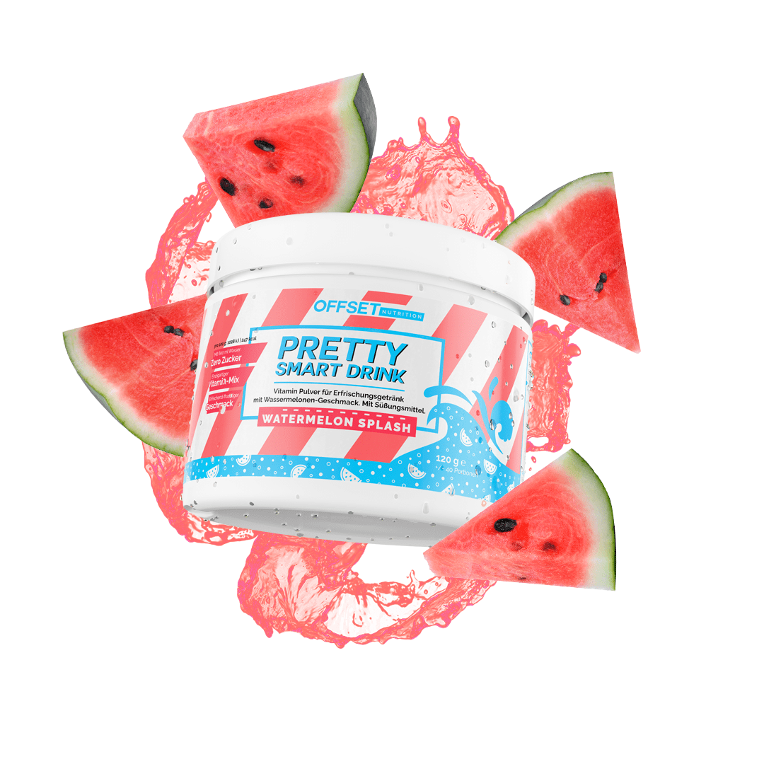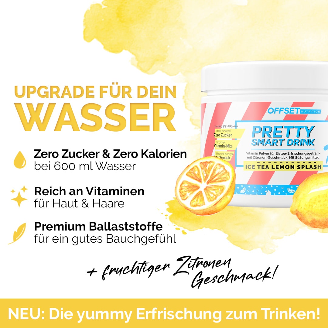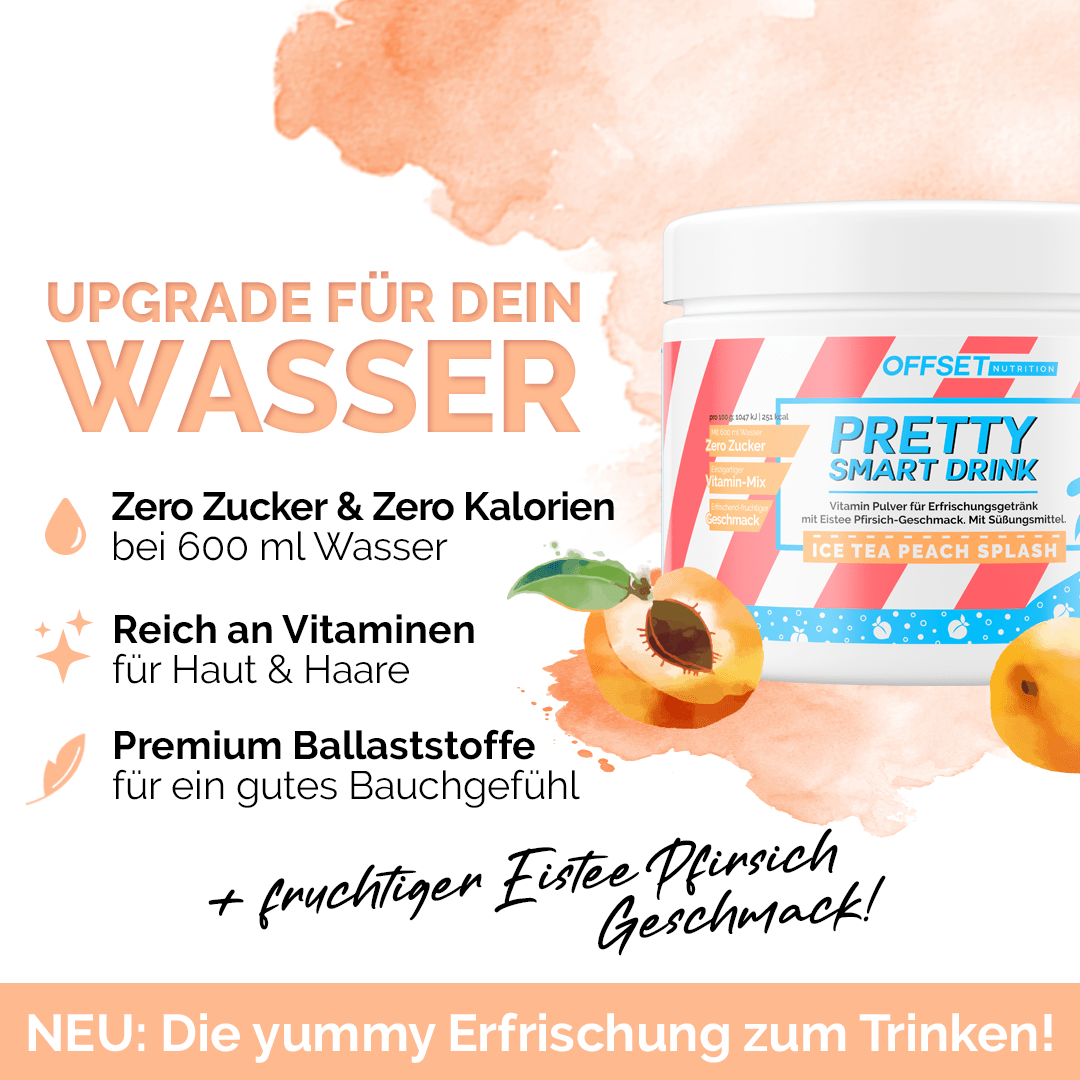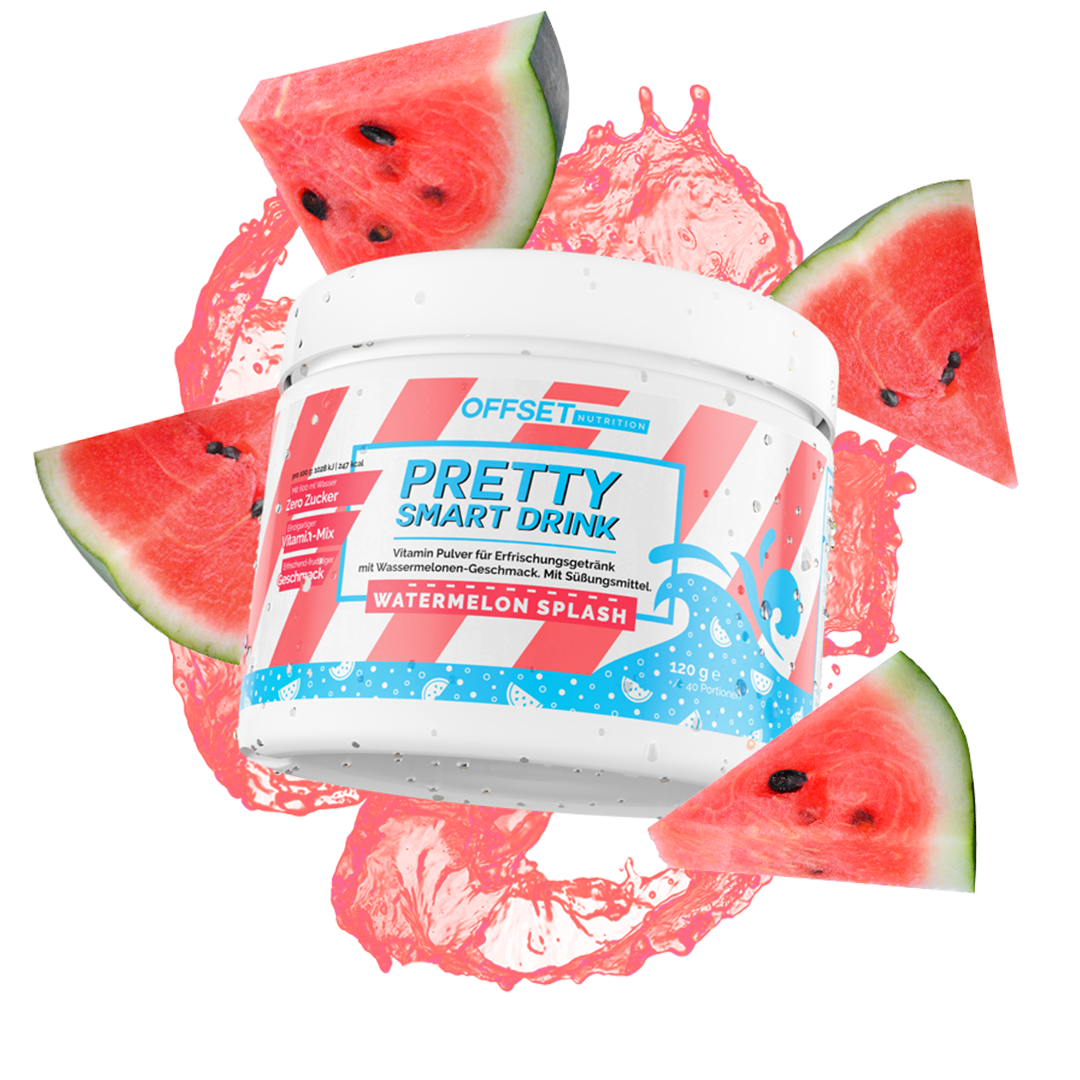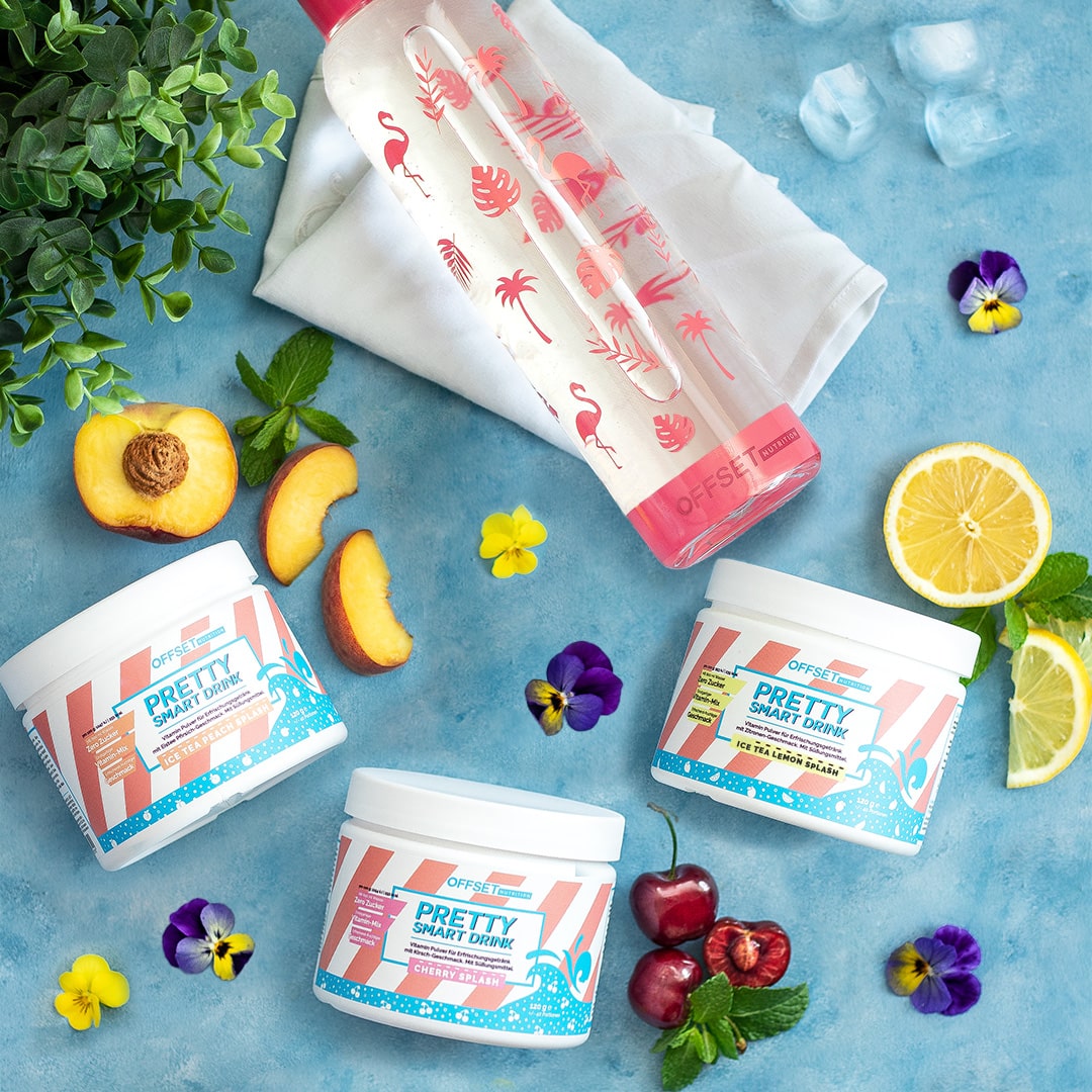 Unser neuer Pretty Smart Drink ist Vitaminpulver, das dein Wasser in eine fruchtige Erfrischung verwandelt! So hilft er dir, mehr zu trinken und passt perfekt in deinen OFFSET-Plan! Der Pretty Smart Drink versorgt dich nicht nur mit 12 wichtigen Vitaminen & Mineralien, er hält auch Premium Ballaststoffe für ein gutes Bauchgefühl bereit! Du kannst den Pretty Smart Drink ganz nach deinem Geschmack dosieren und mixen.