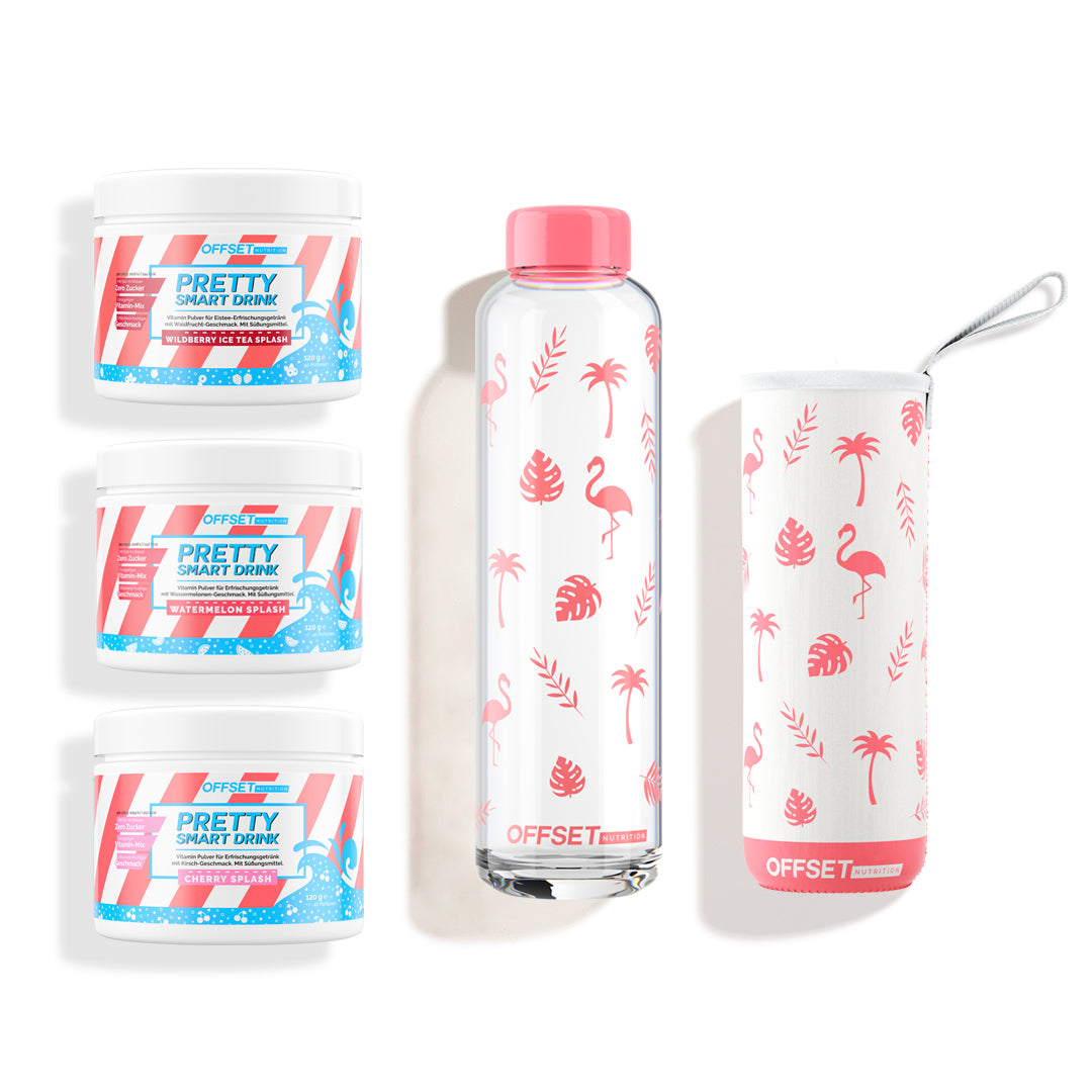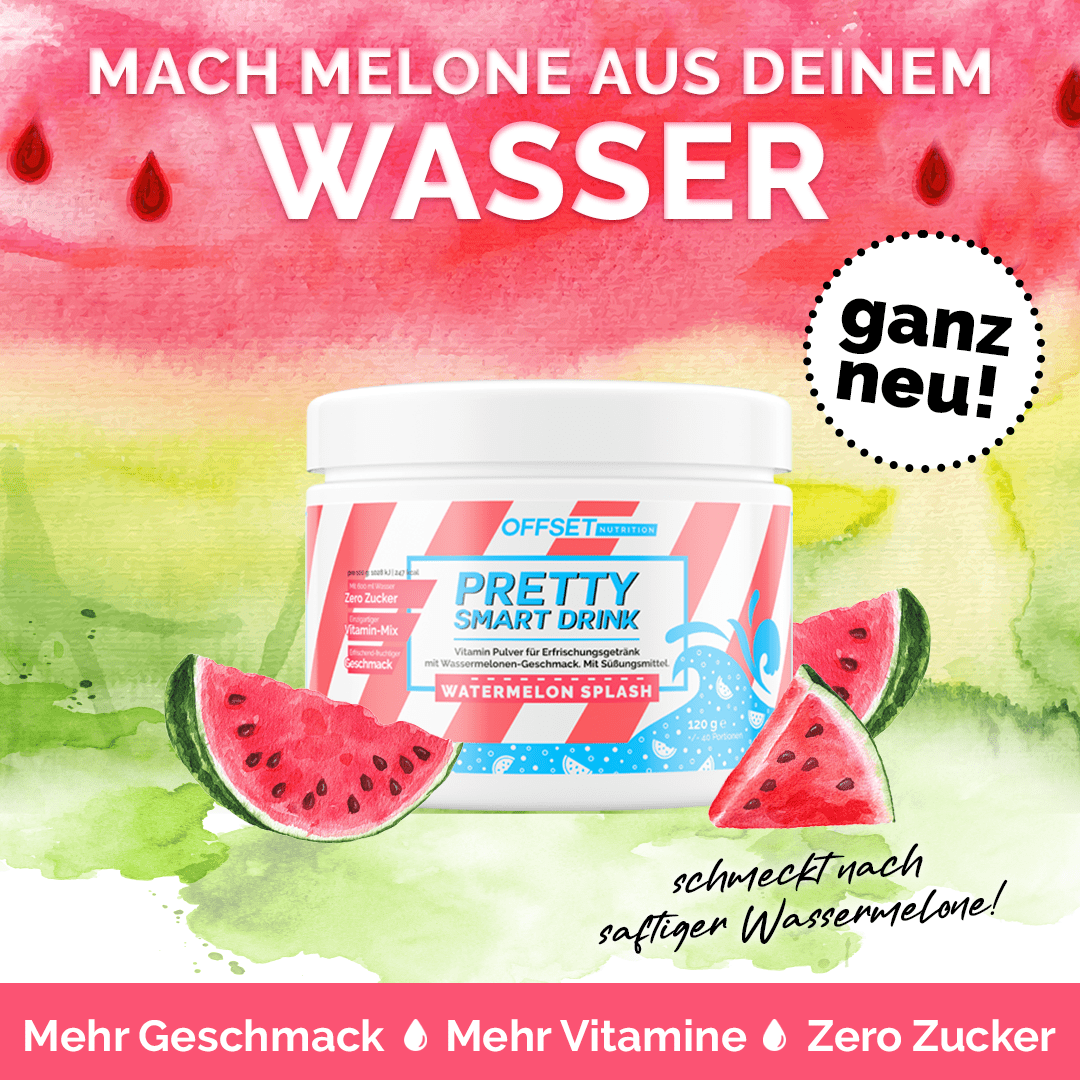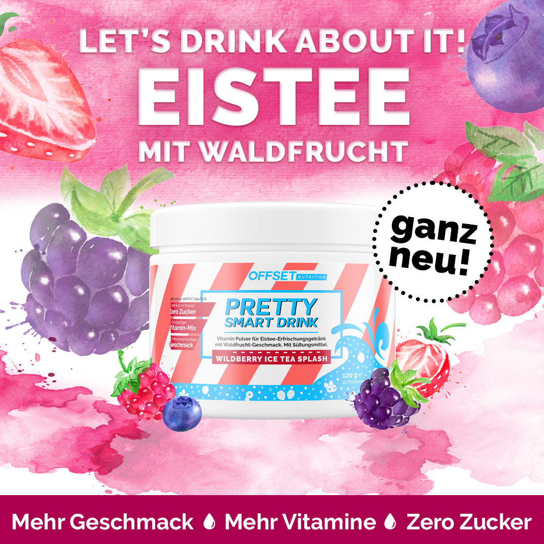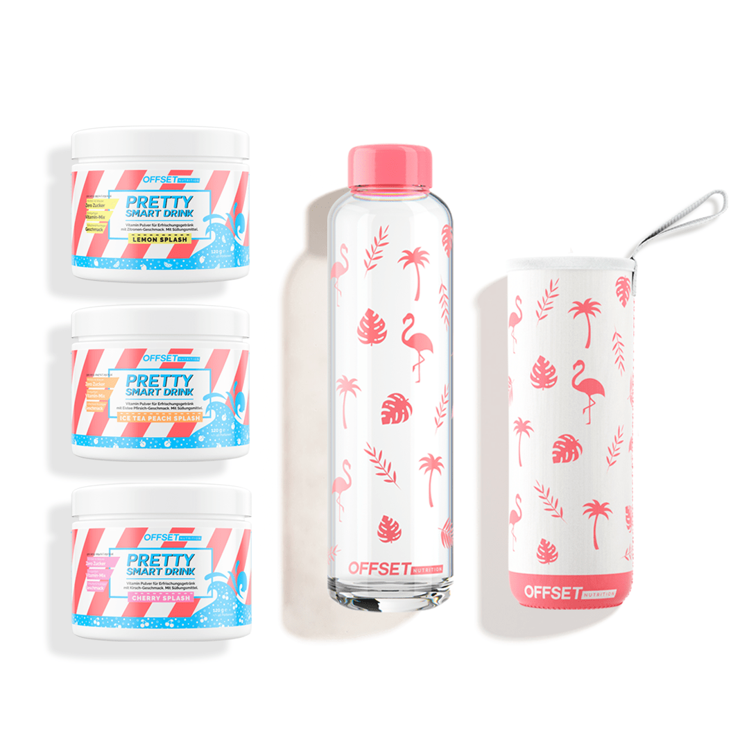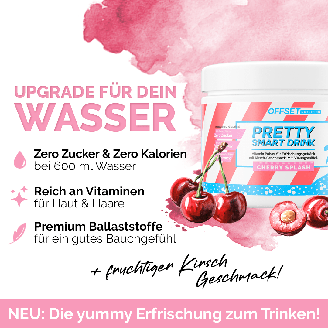 Unser neuer Pretty Smart Drink ist Vitaminpulver, das dein Wasser in eine fruchtige Erfrischung verwandelt! So hilft er dir, mehr zu trinken und passt perfekt in deinen OFFSET-Plan! Der Pretty Smart Drink versorgt dich nicht nur mit 12 wichtigen Vitaminen & Mineralien, er hält auch Premium Ballaststoffe für ein gutes Bauchgefühl bereit! Du kannst den Pretty Smart Drink ganz nach deinem Geschmack dosieren und mixen.