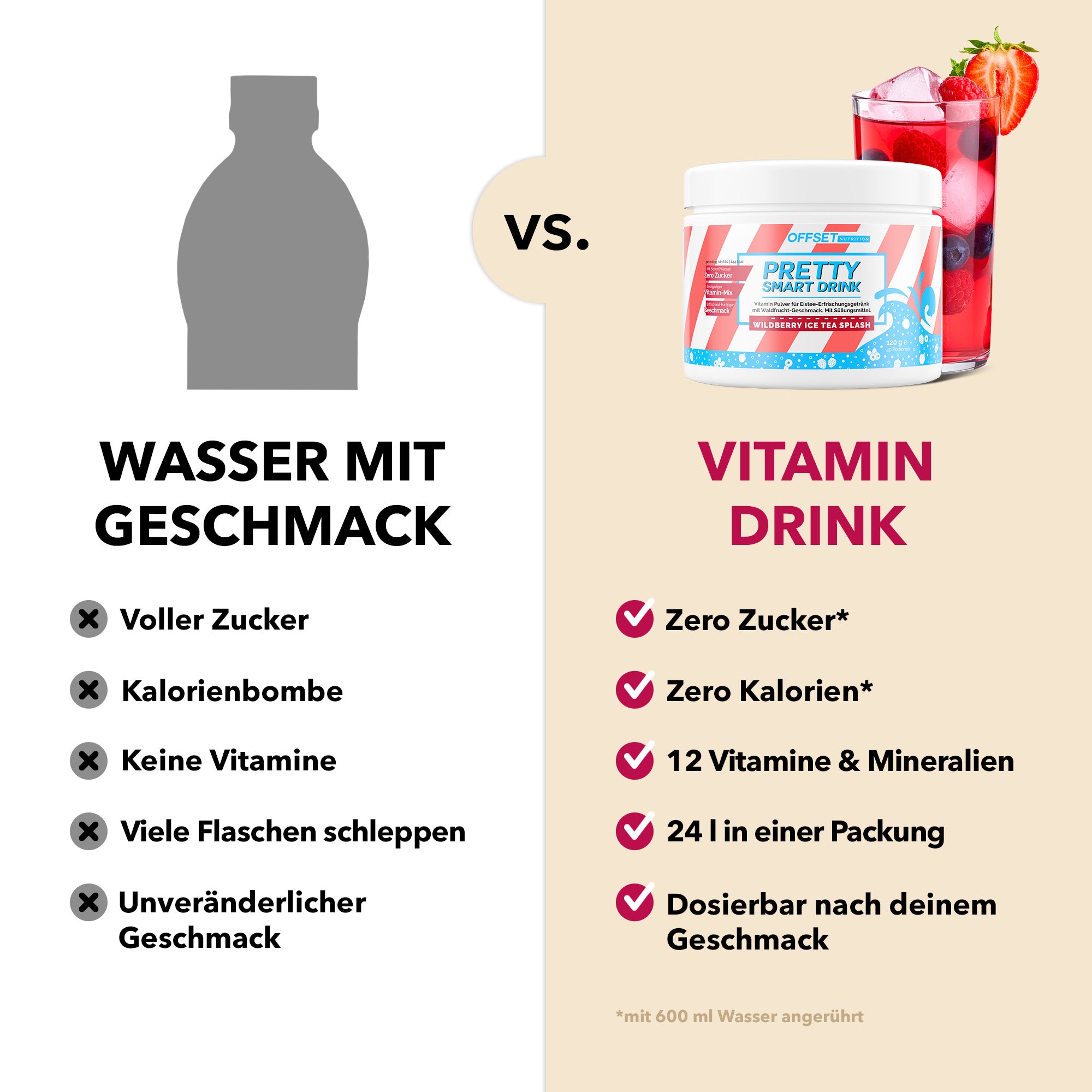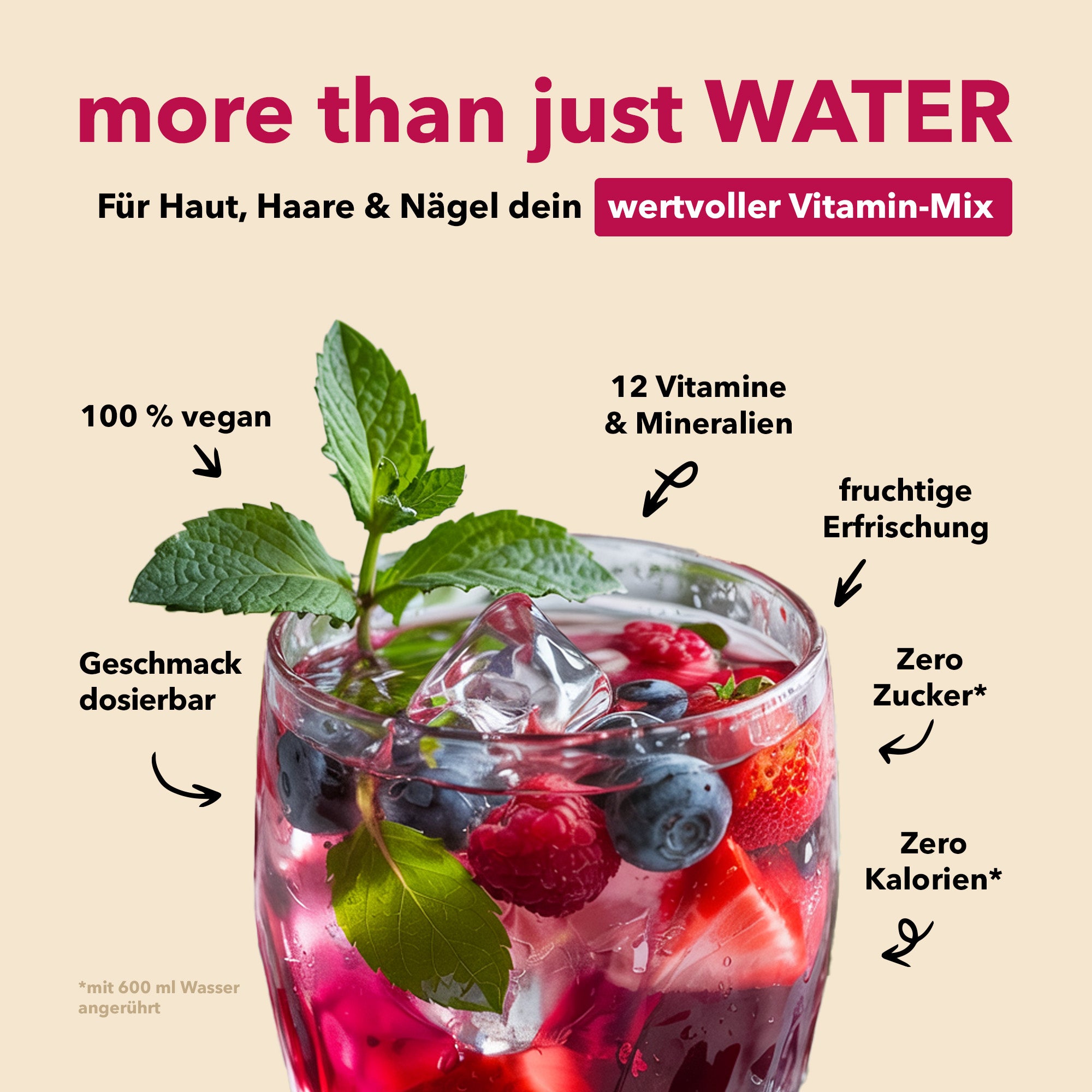 Unsere Vitamin Drinks vereinen das Beste aus zwei Welten: Den erfrischenden Genuss eines leckeren Getränks mit der optimalen Nährstoffversorgung hochwertiger Vitamine und Mineralstoffe. Jeder Schluck motiviert dich, mehr zu trinken – und versorgt deinen Körper gleichzeitig mit Ballaststoffen bei Zero Kalorien & Zero Zucker. Perfekt für alle, die ihre tägliche Trinkmenge erhöhen möchten, ohne auf Geschmack zu verzichten.